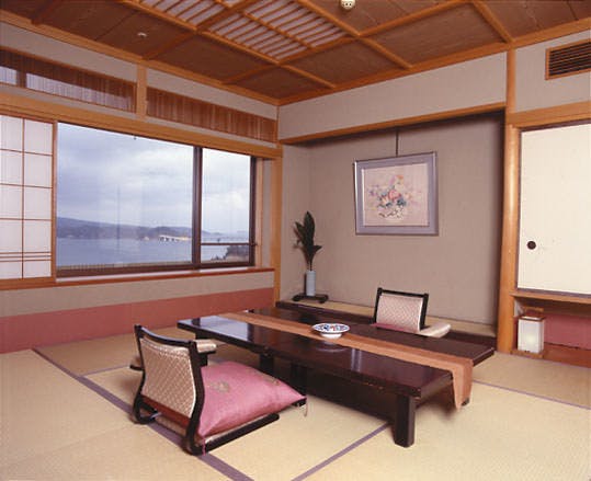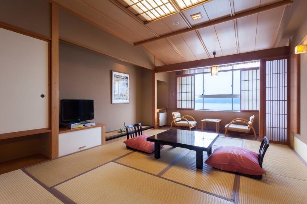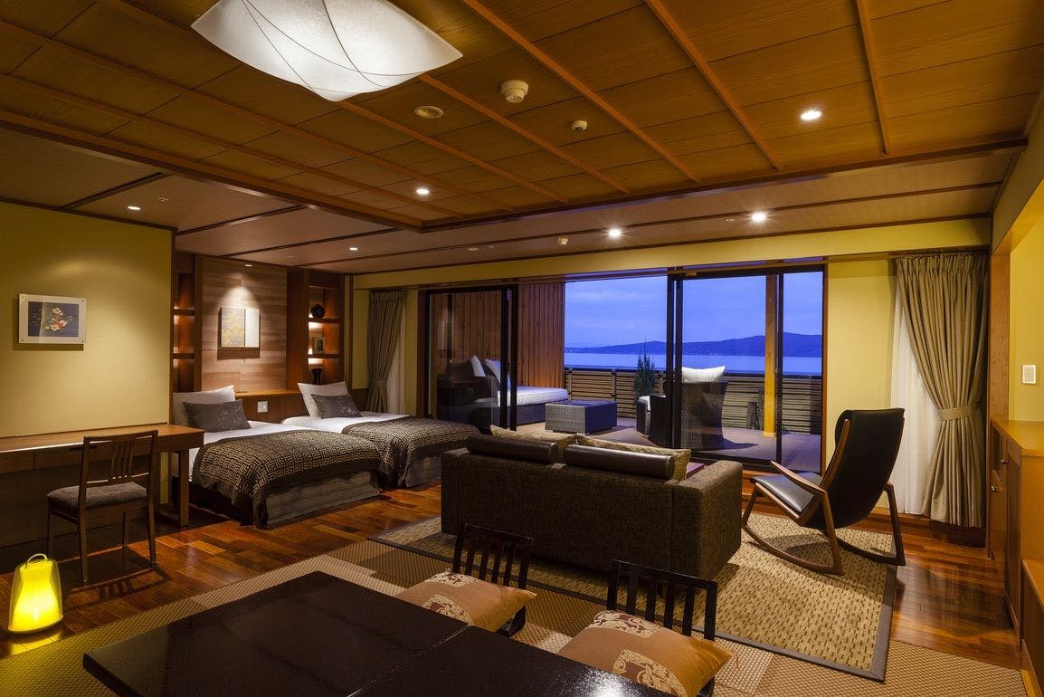 穏やかな七尾湾を眺めるパノラマオーシャンが広がるお部屋。テラスのジャグジーからは、能登島大橋や対岸の能登島を一望いただけます。※お部屋は和室タイプ、和洋室タイプのどちらかになります(選択不可)