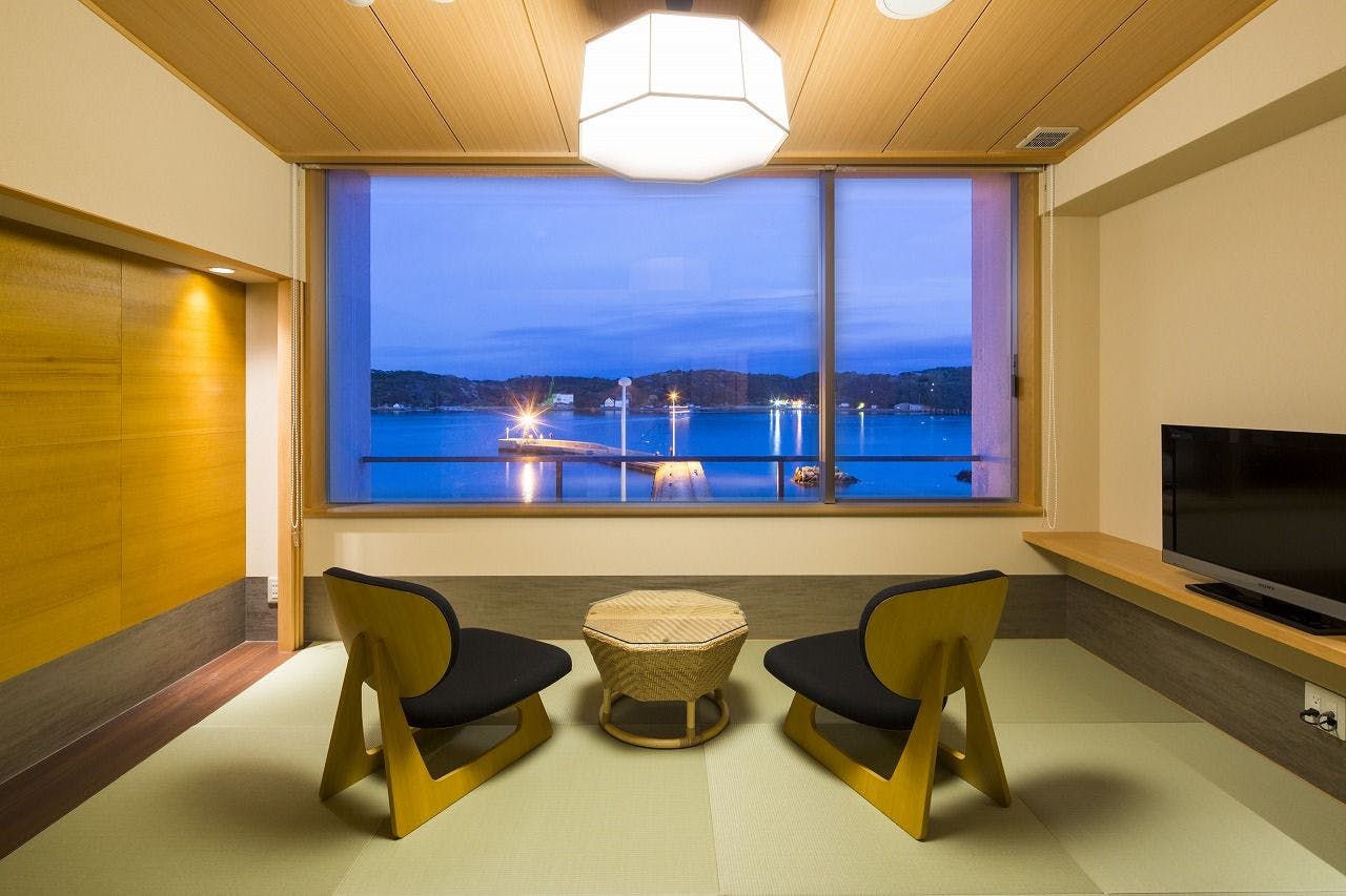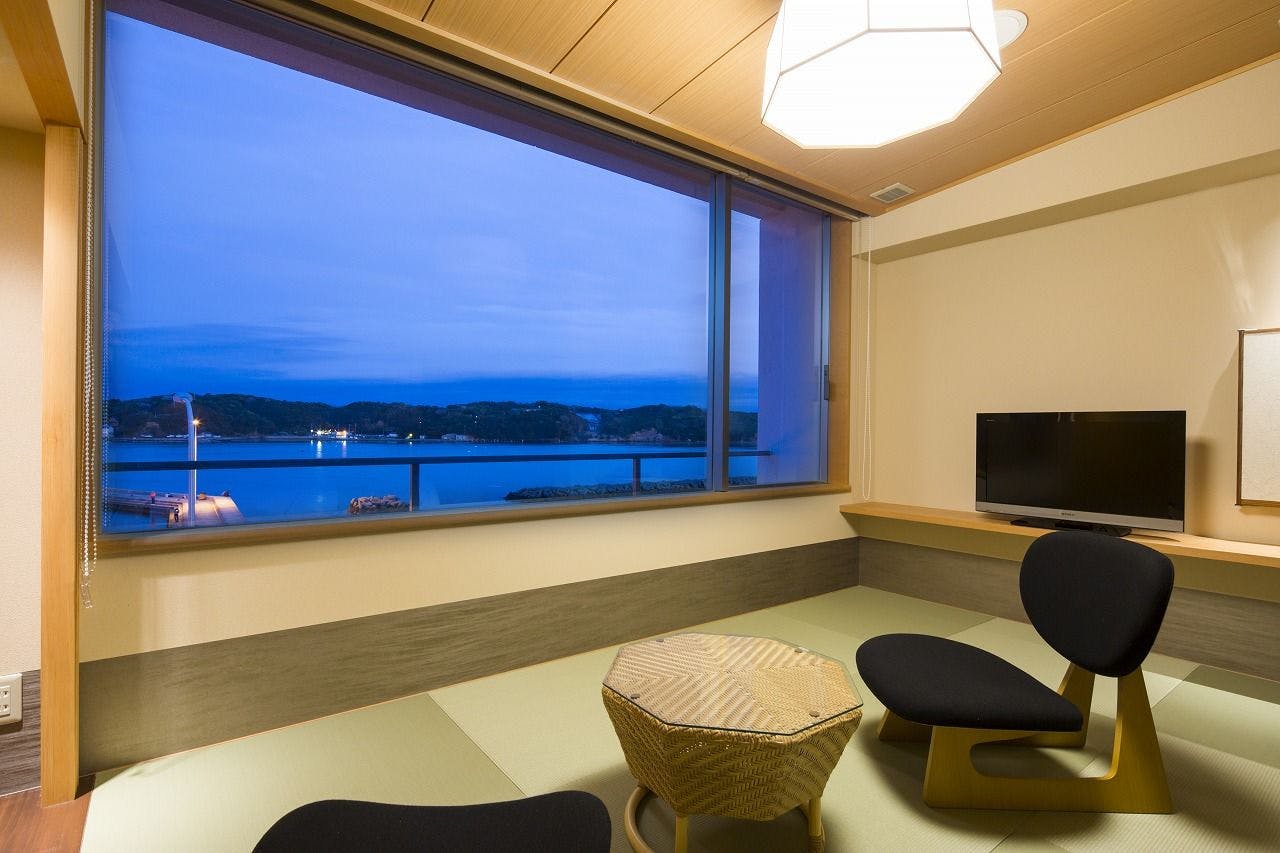大きな窓からは、朝晩暮れゆく的矢湾の風景をお楽しみください。特別な記念日にもおすすめです。