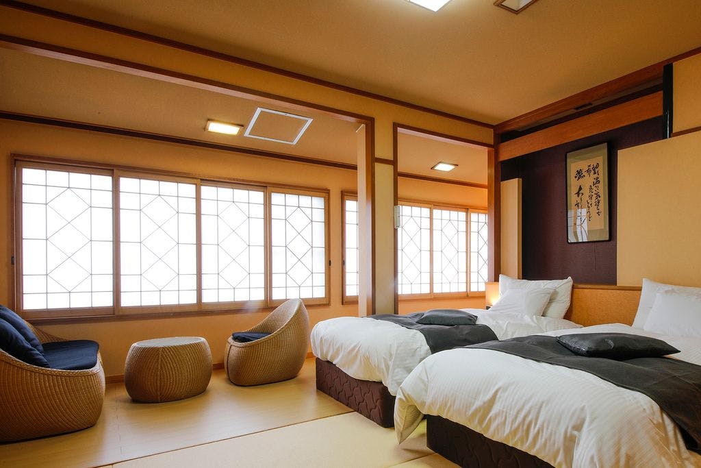 4.5畳和室部分+ツインベッドの和洋室バス+ウォシュレット(海は見えません)就寝はベッド利用お食事は1階お食事処にて(お部屋食対応不可)禁煙ルーム