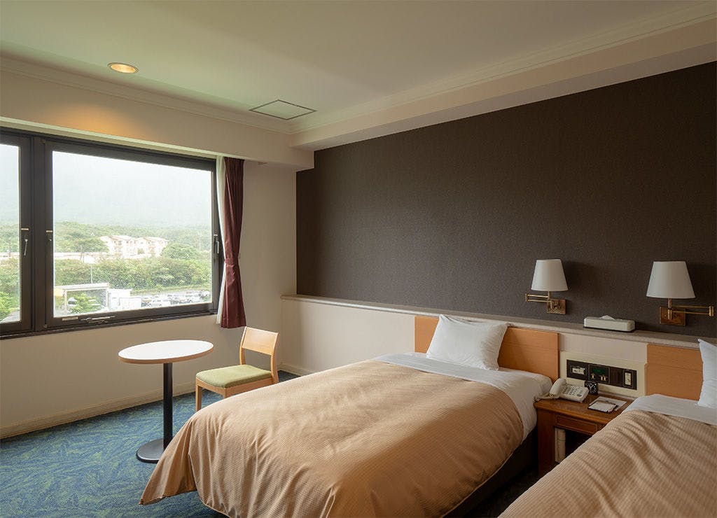MIZUMORIフロアにあります。洋室ツインタイプのお部屋です。バストイレ付です。眺望は海山おまかせになりますが山側が多いので山側になる確率のほうが高くなります。