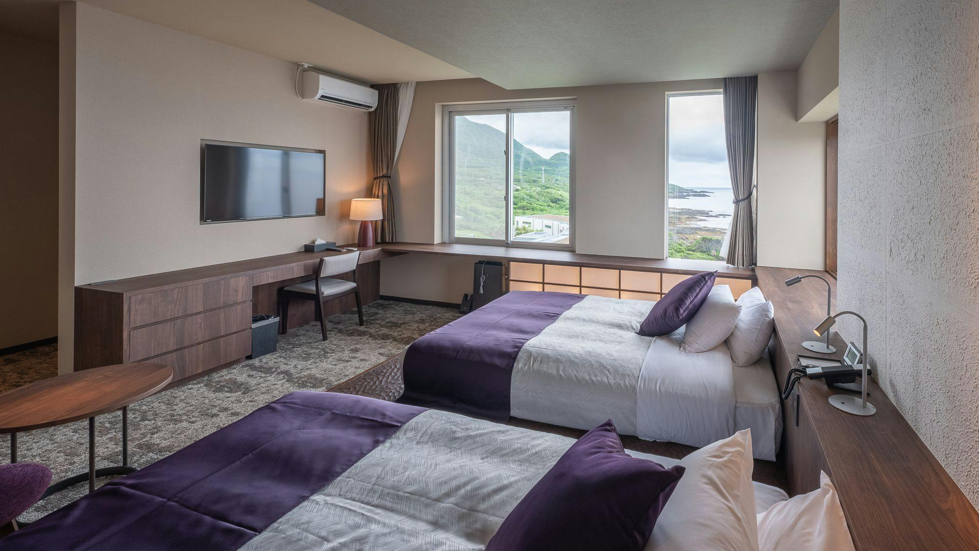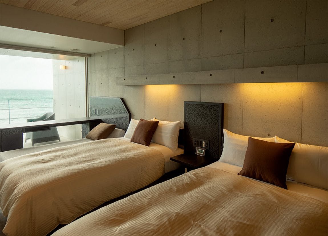 別邸(波音日和)の洋室ツインルームです。全室オーシャンビューとなります。バルコニー付きのお部屋です。お子様のご利用は中学生以上からの受け入れとなります。