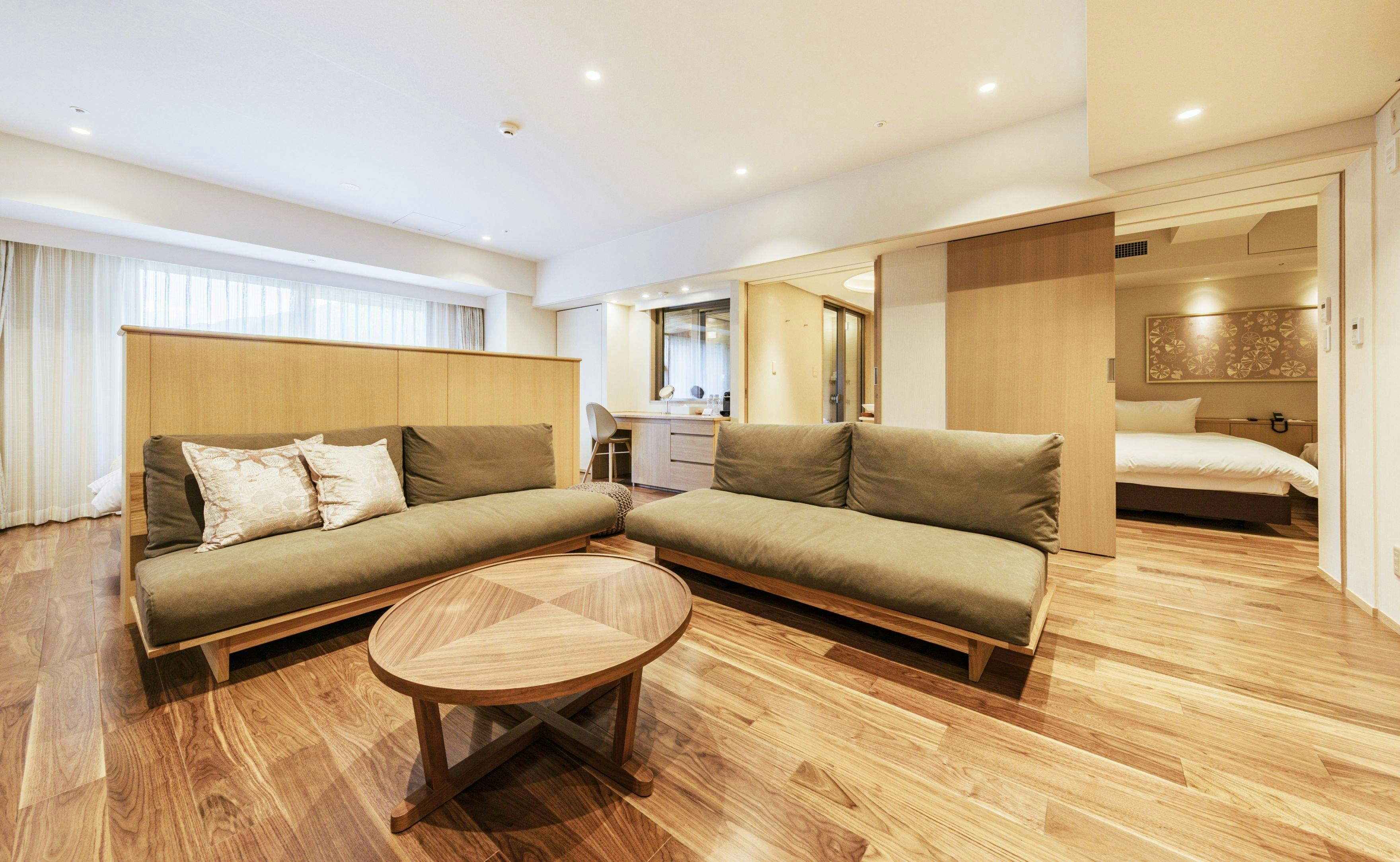 広々としたリビングと大人3人でも充分な広さの源泉露天風呂で一息つける癒しのひとときを。