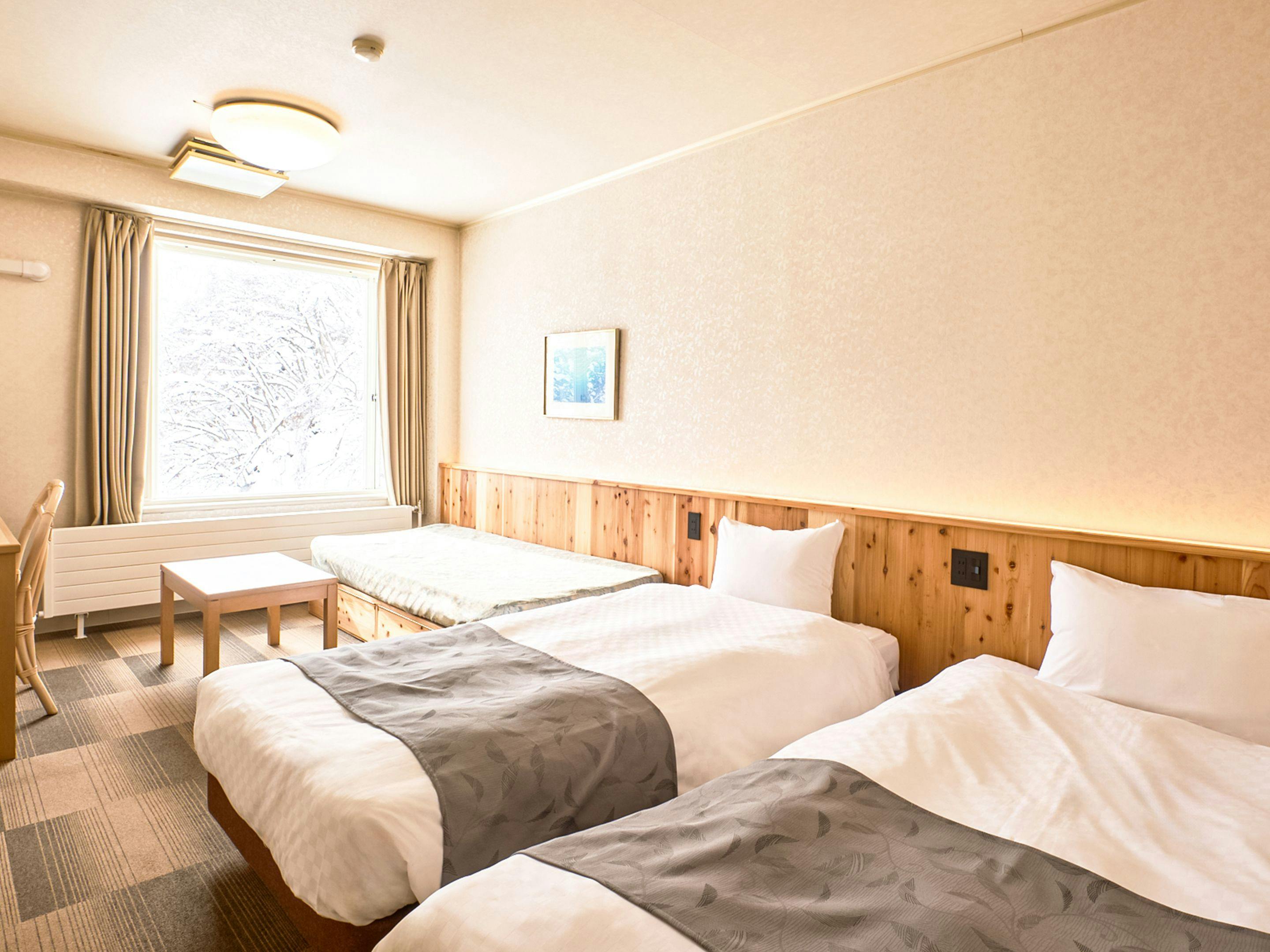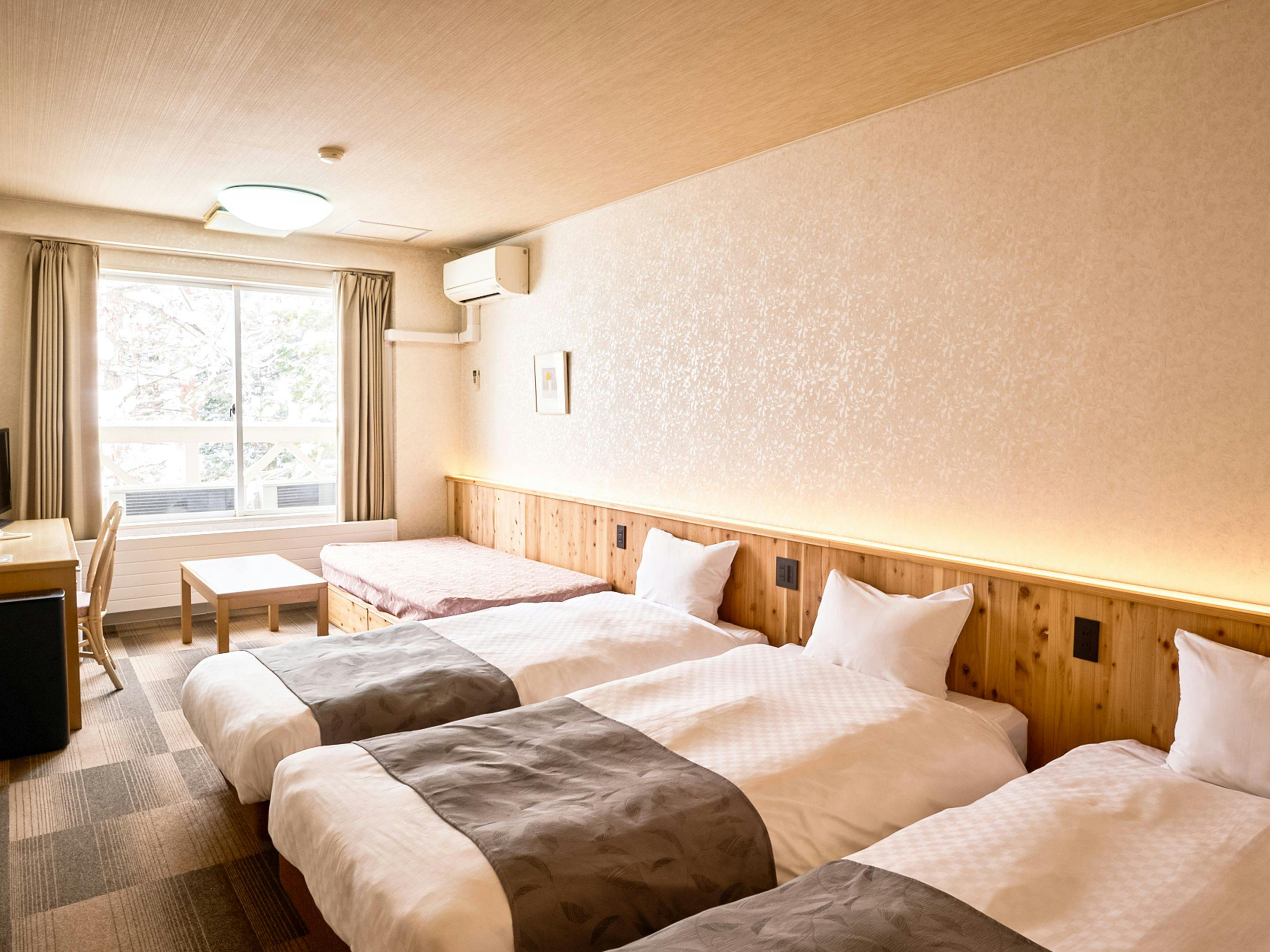 お部屋にお風呂・トイレが無いタイプになりますので大浴場と共同のお手洗いをご利用お願いします。 ベッド3台(4名利用の場合はエキストラベッドの追加)全室無料インターネット接続(Free Wi-Fi)・寝巻:有り