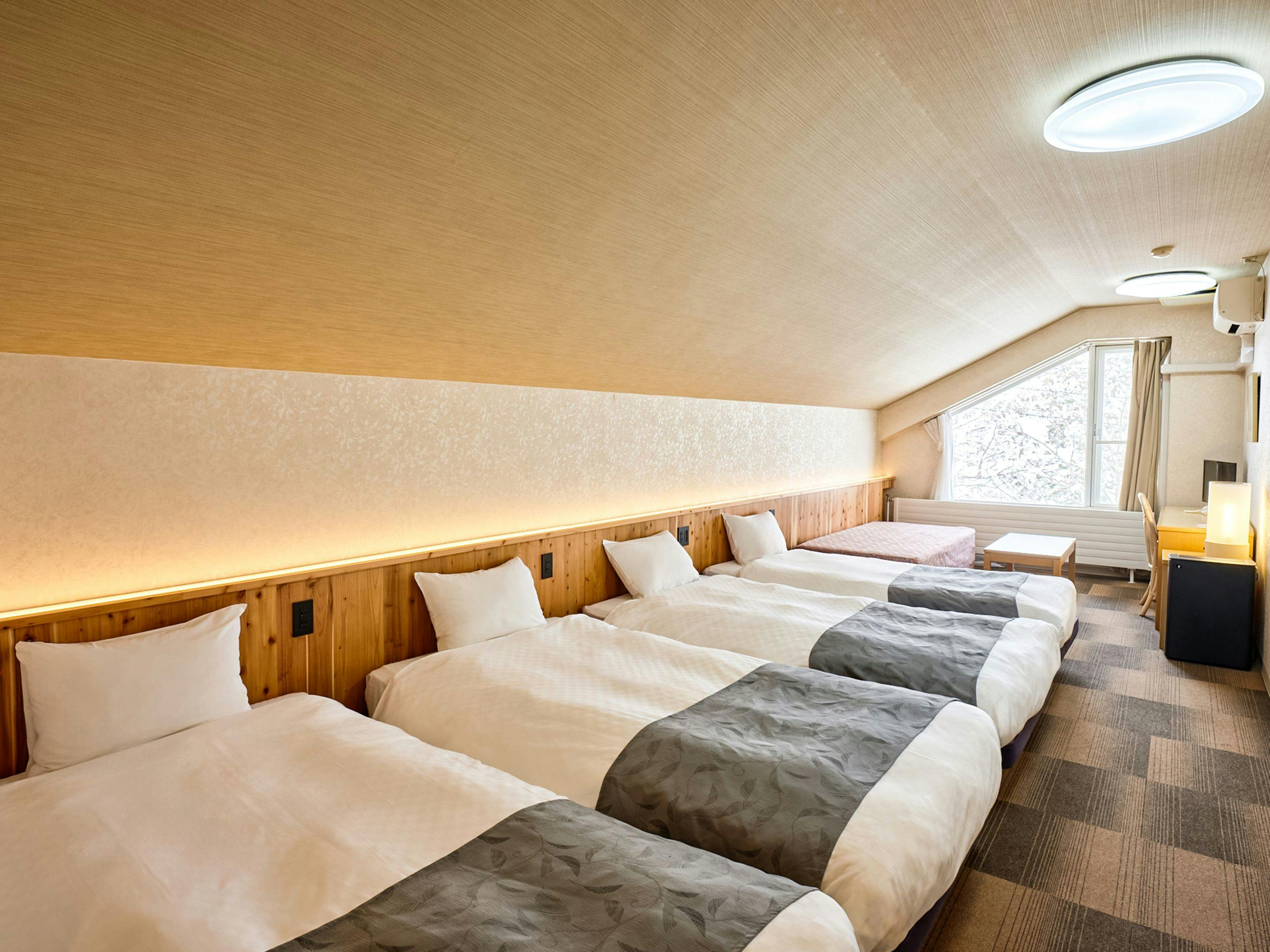 お部屋にお風呂・トイレが無いタイプになりますので大浴場と共同のお手洗いをご利用お願いします。 ベッド4台(5名利用の場合はエキストラベッドの追加) 全室無料インターネット接続(Free Wi-Fi)・寝巻:有り