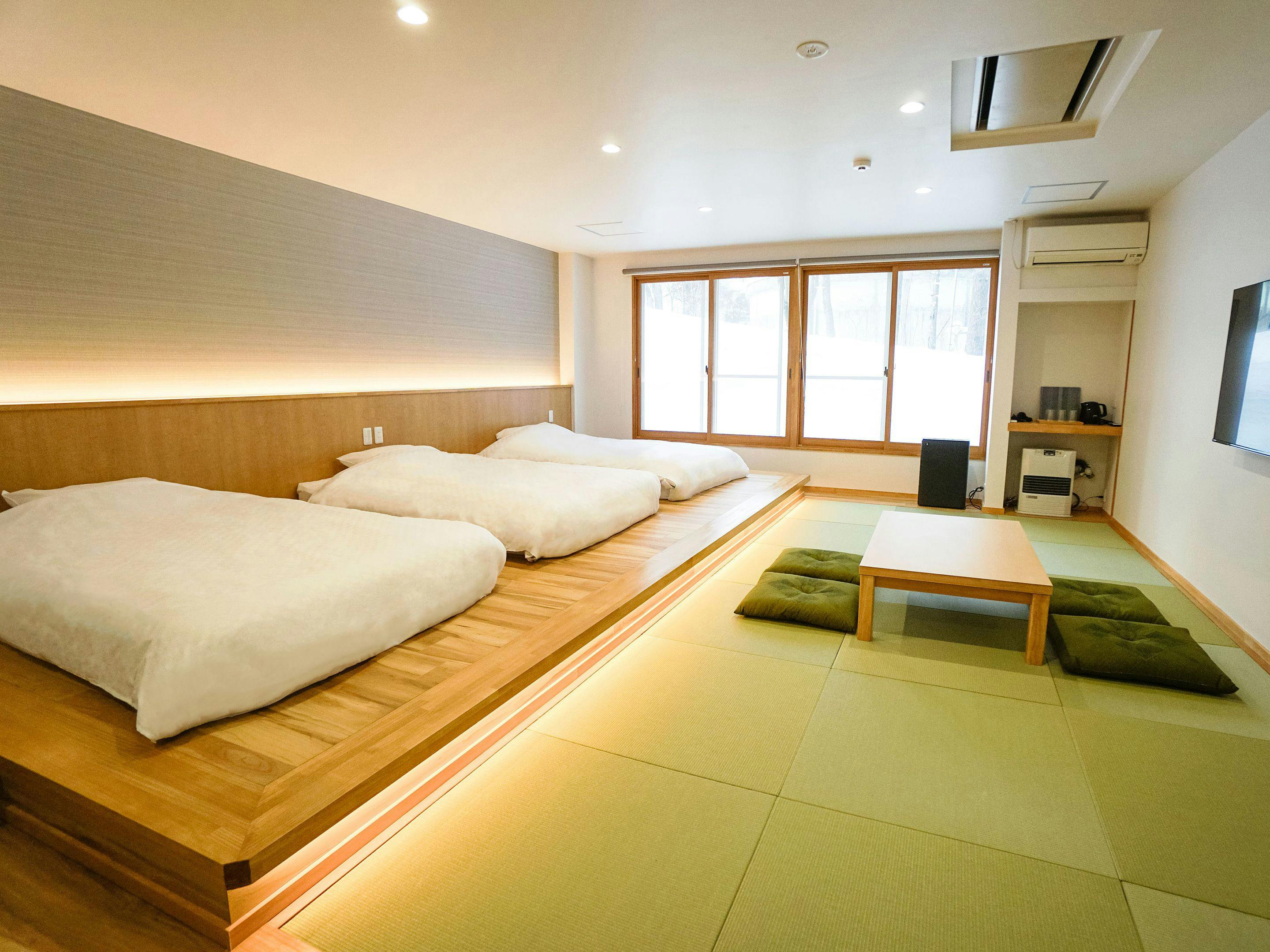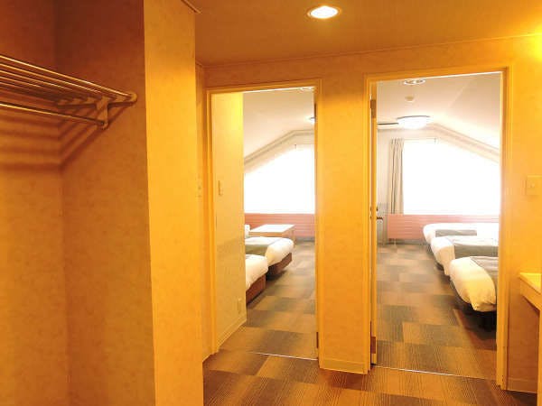 1つのお部屋内にさらに2つのお部屋がございます! お部屋にユニットバスのあるお部屋になります。ベッド5台(6名利用の場合はエキストラベッドの追加)全室無料インターネット接続(Free Wi-Fi)・寝巻:有り