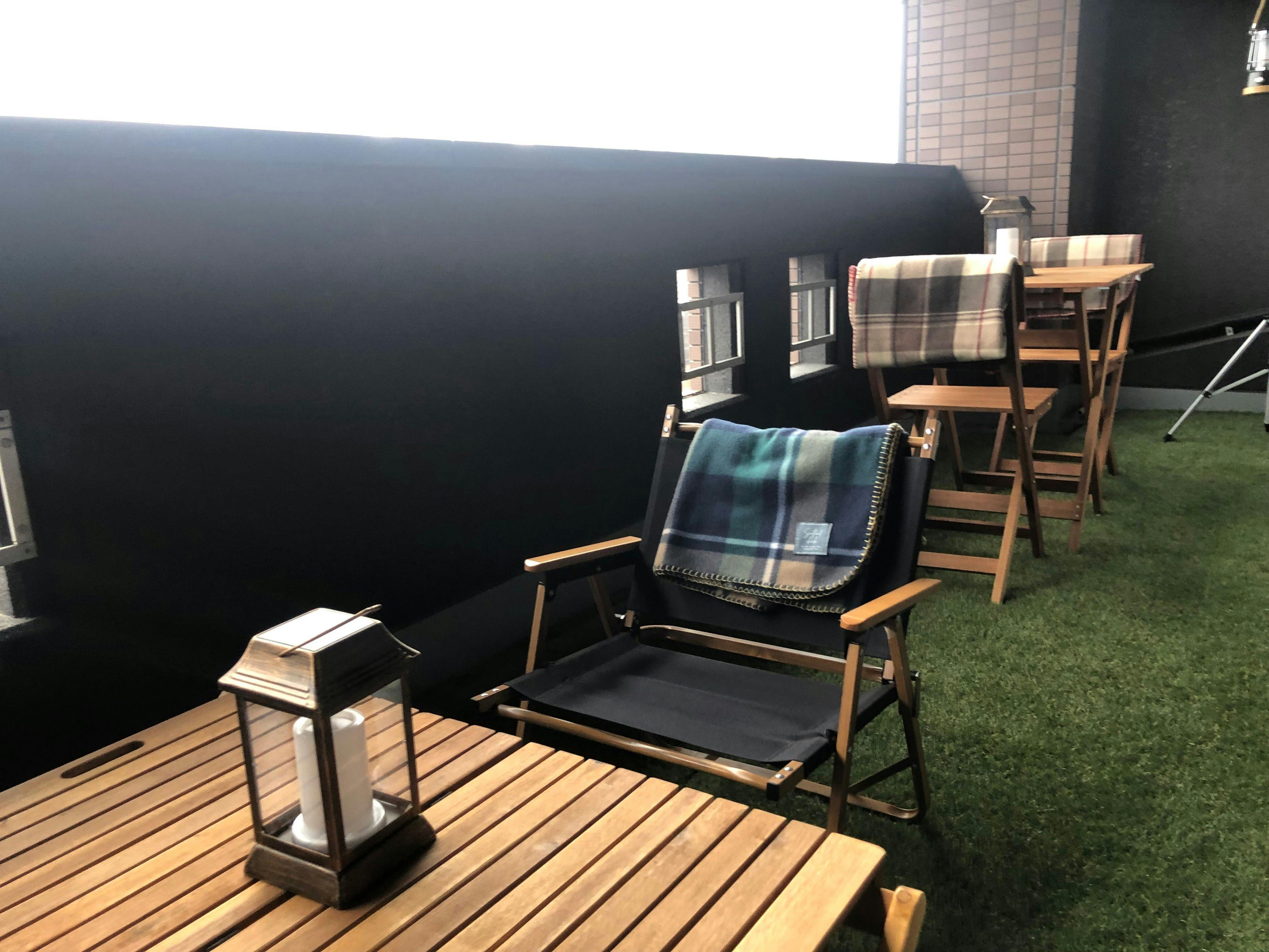 テラスにはウッドテーブル・チェアを備え付けております。