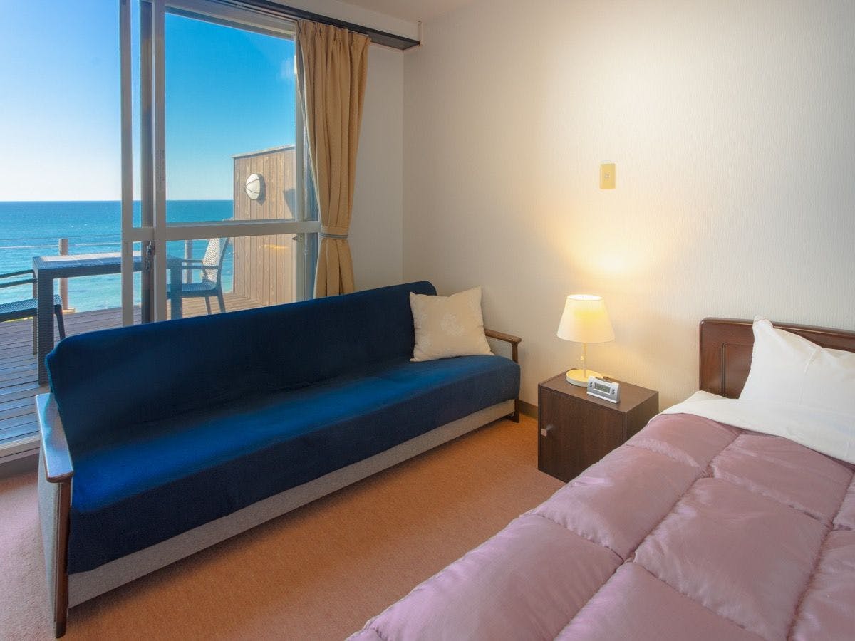 丹後屈指の日本海の絶景を堪能する【シングルルーム+絶景サンデッキ】です。一人旅やビジネス利用にオススメ!館内Wi-Fi使用可、冷蔵庫、ユニットバス付※2名で利用の場合は、エキストラベットをご用意します。【アメニティ・設備】テレビ、ポット、お茶セット、冷蔵庫、ドライヤー、ボディーソープ、シャンプー、リンス、ハミガキセット、タオル、バスタオル、浴衣、スリッパ、等々※2名様でご利用の場合、エキストラベットをご用意させて頂きます。