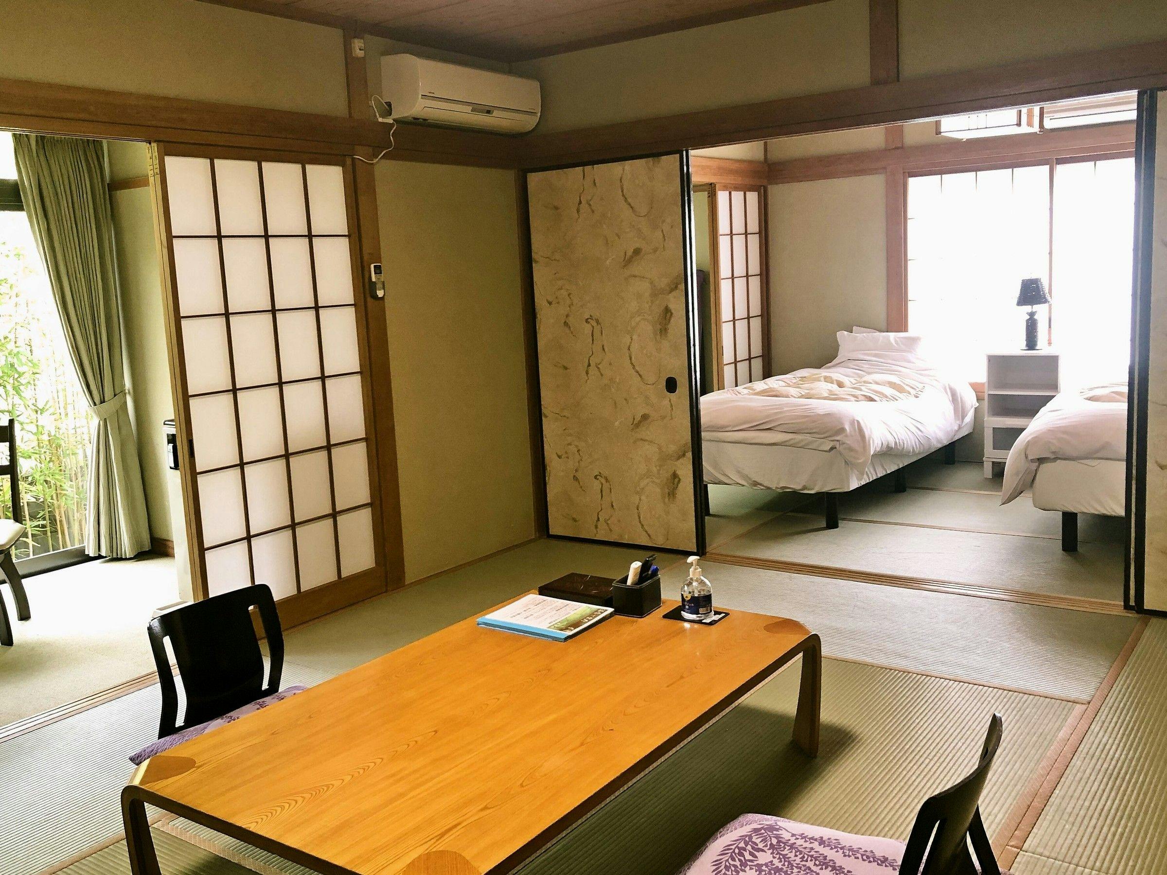 ふすまによって仕切られてベッド2台あります。客間が二間ついたお部屋です。仲の良いご友人や、あるいは3世代ご家族でのちょっとしたグループ旅行に最適なお部屋タイプです。お部屋のお風呂も源泉掛流し100%の天然温泉でいつでも入り放題です。※こちらのお部屋は愛犬はご利用できません。