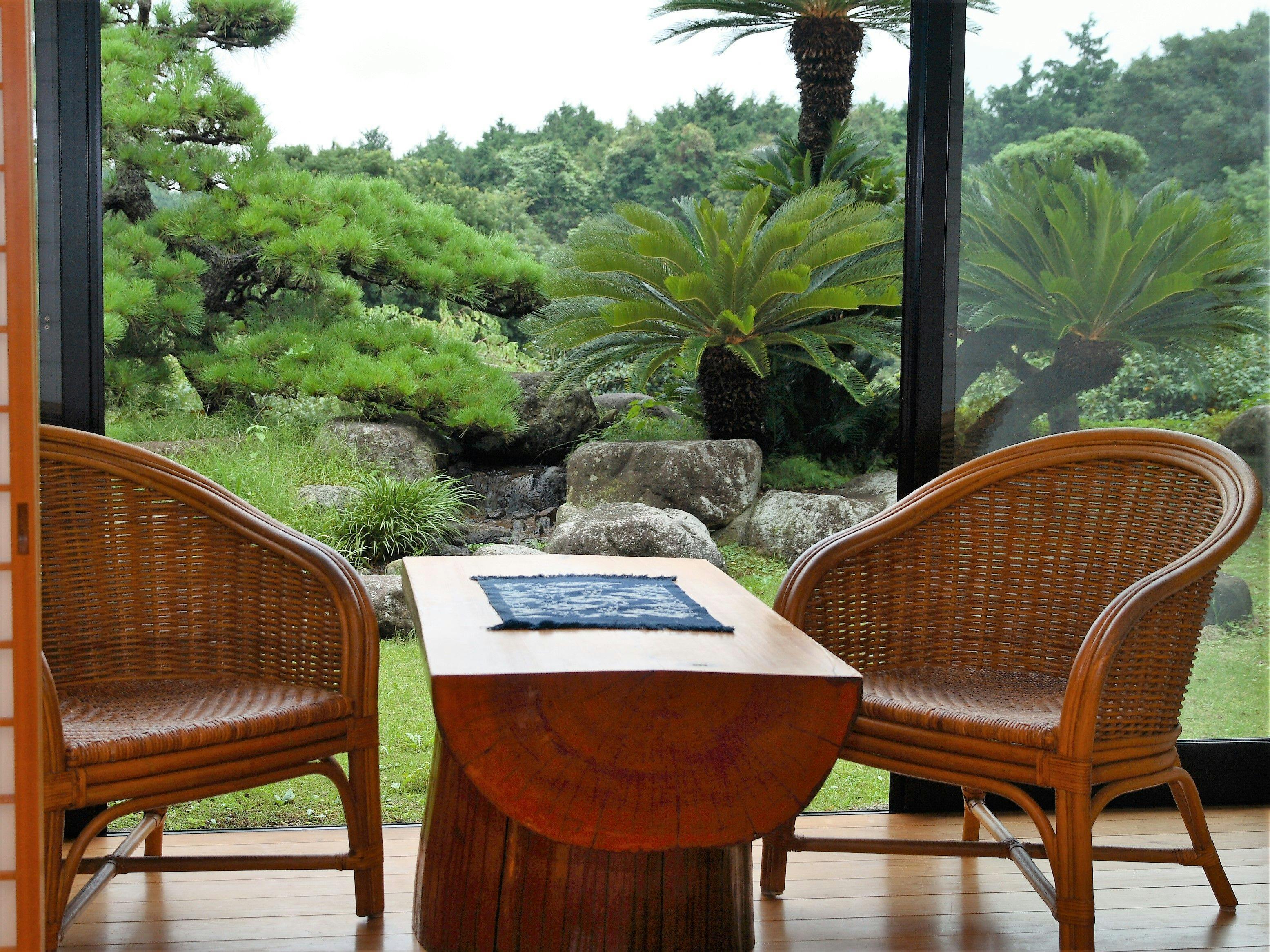 窓際の広縁には丸太のテーブルとラタンの椅子。