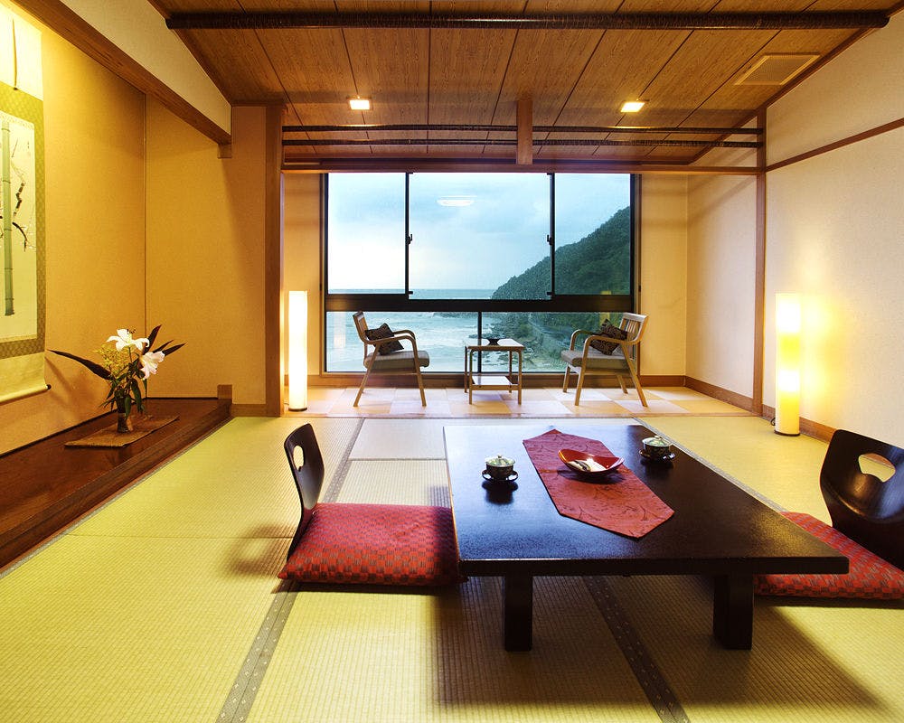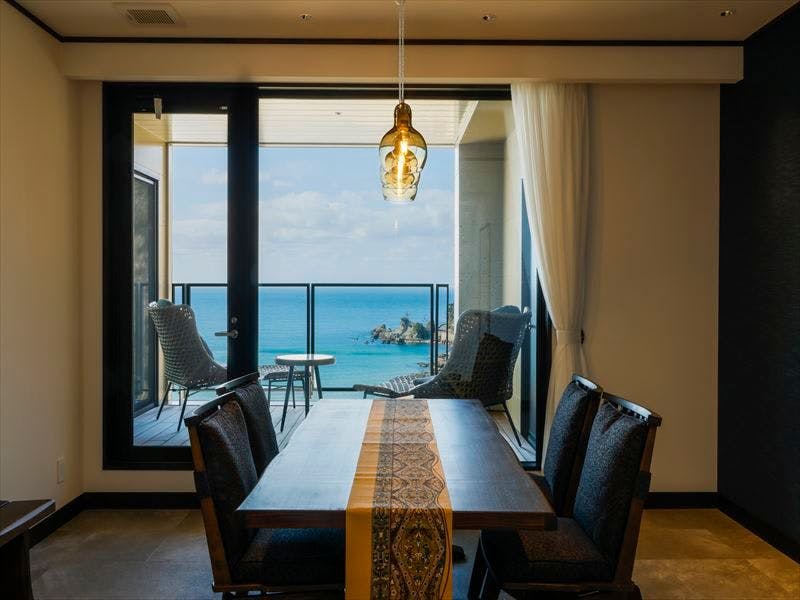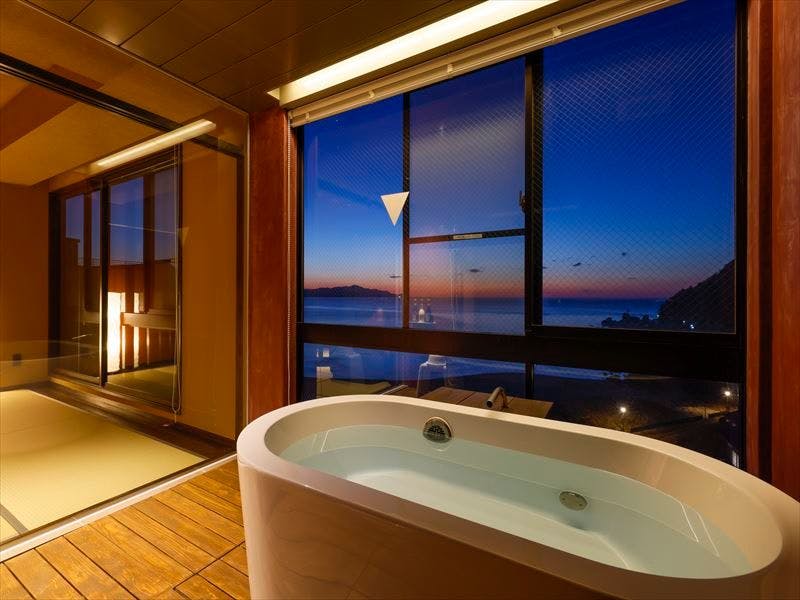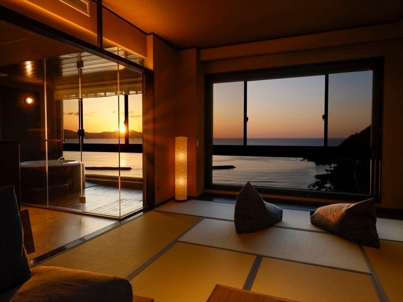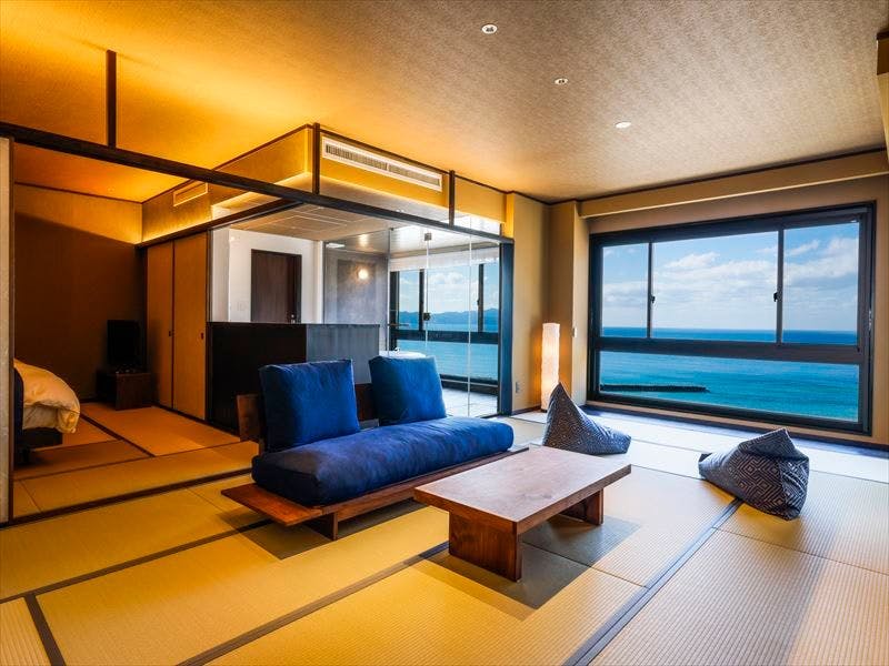 14帖の和室、ベッドルーム、ジャグジー付半露天温泉、専用食事室、テラスすべて”絶景”オーシャンビュー
