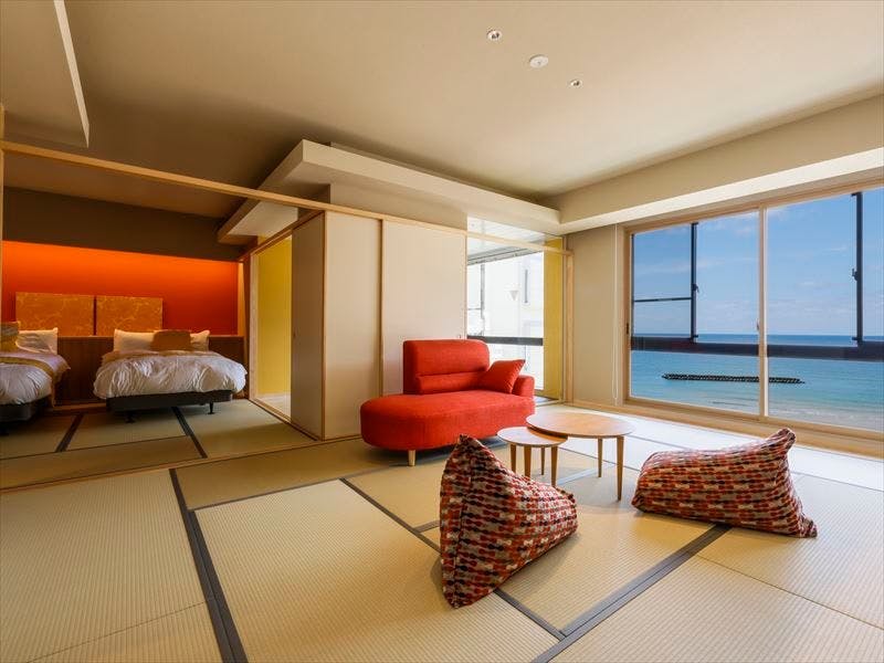 大きな窓に海を望める和室14畳の雰囲気に合わせたローベッドルームには、シモンズ製のセミダブルをご用意。その他、温泉ジャグジーやテラス、専用お食事室、お部屋の何処にいても海が目の前に広がっています。