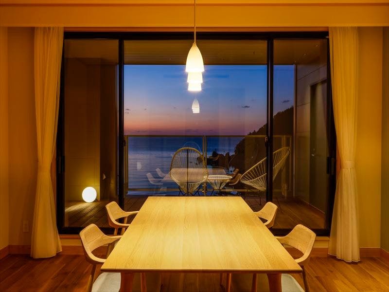 大きな窓に海を望めるこのお部屋は落ち着いた和モダンの14畳、ベッドルームには、シモンズ製のセミダブルをご用意。その他、開放的な温泉ジャグジーやテラス、専用お食事室などがあり、お部屋の何処にいても海が目の前に広がっています。