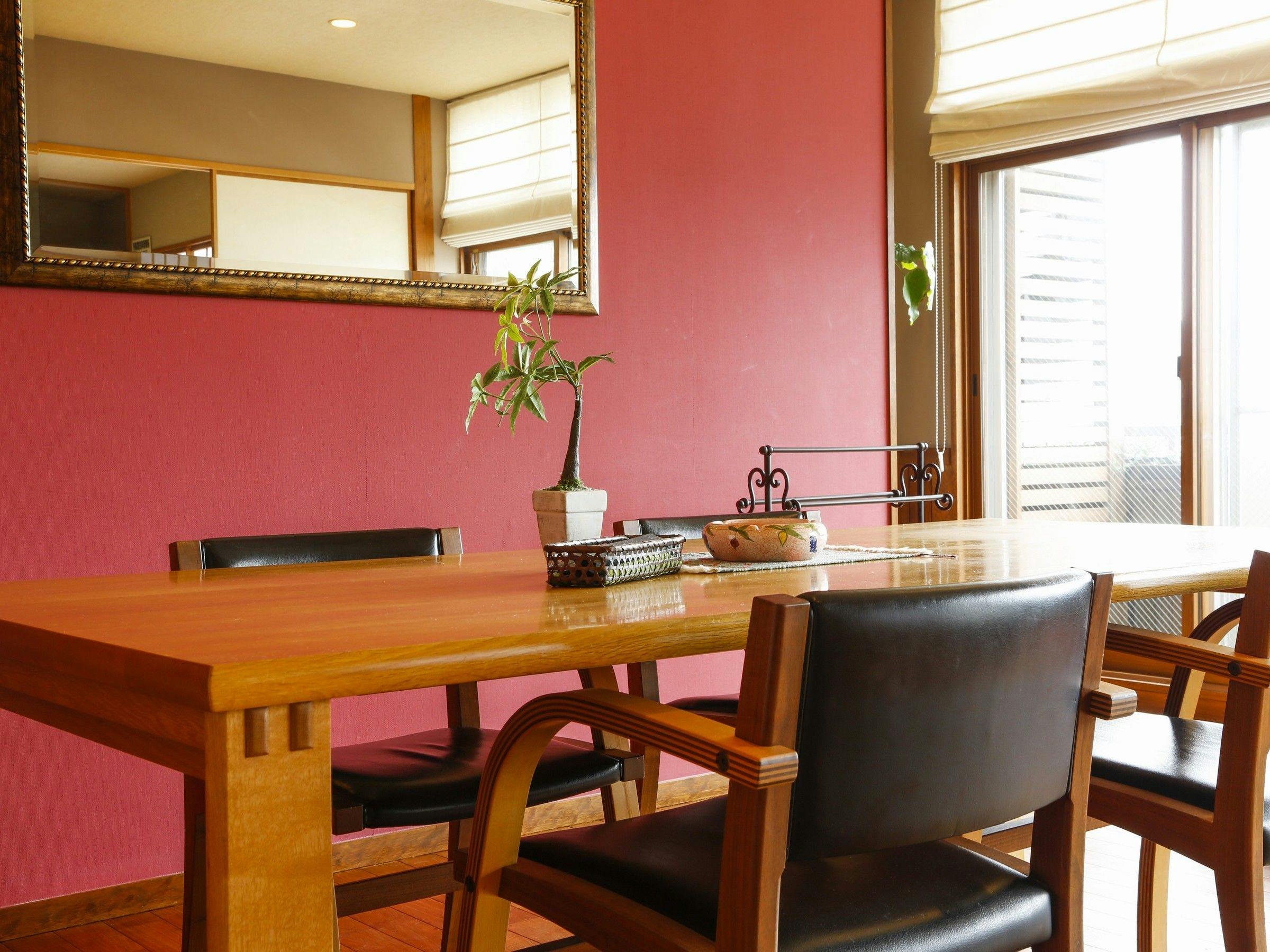 和室(部屋食)ダイニングルームにてダイニングルーム<30平米>2m×1mダイニングテーブル、ソファー、46インチ液晶テレビ、空冷蔵庫洗面台・イストイレ<自動ウォシュレット>部屋風呂はありません。