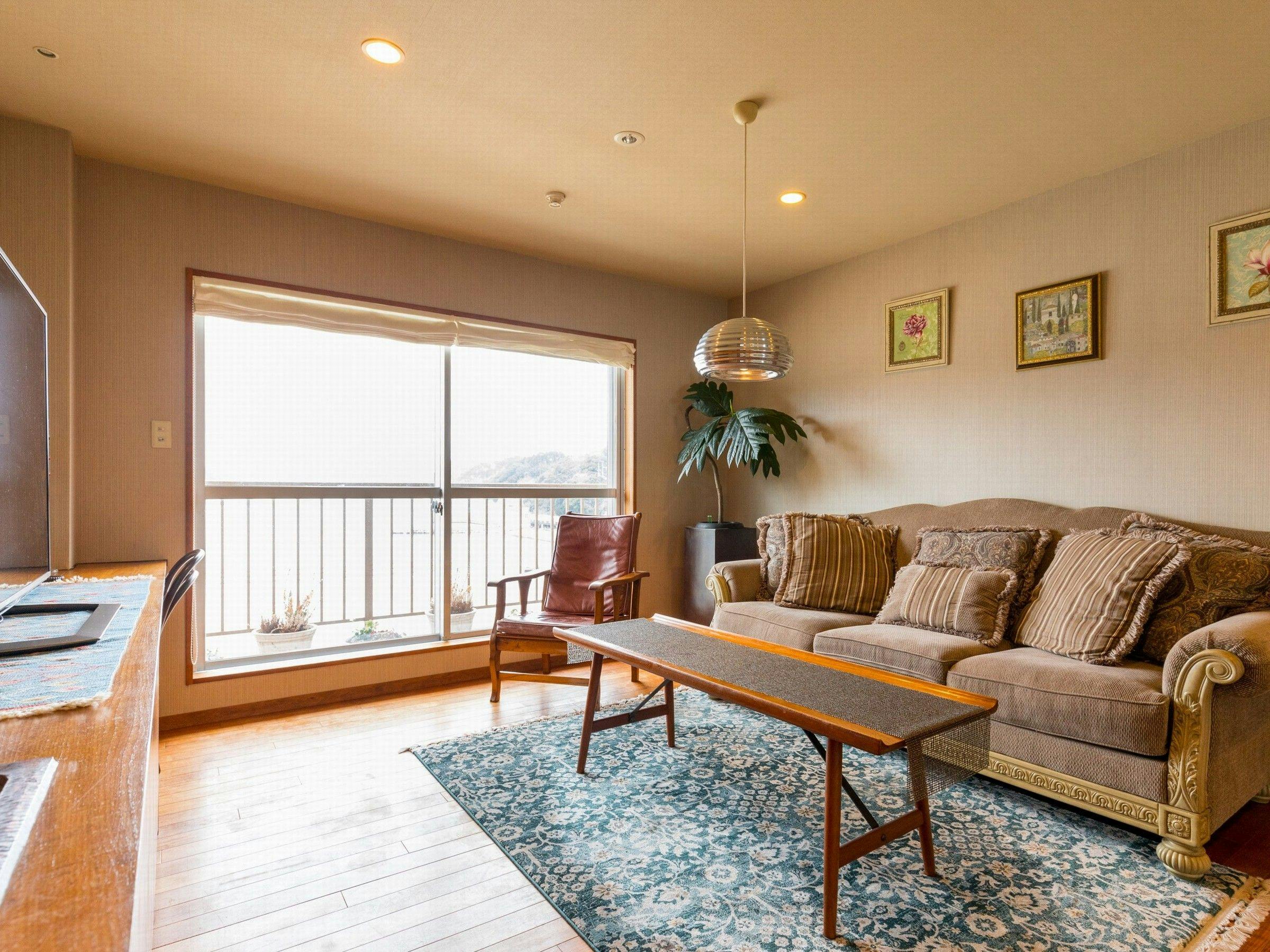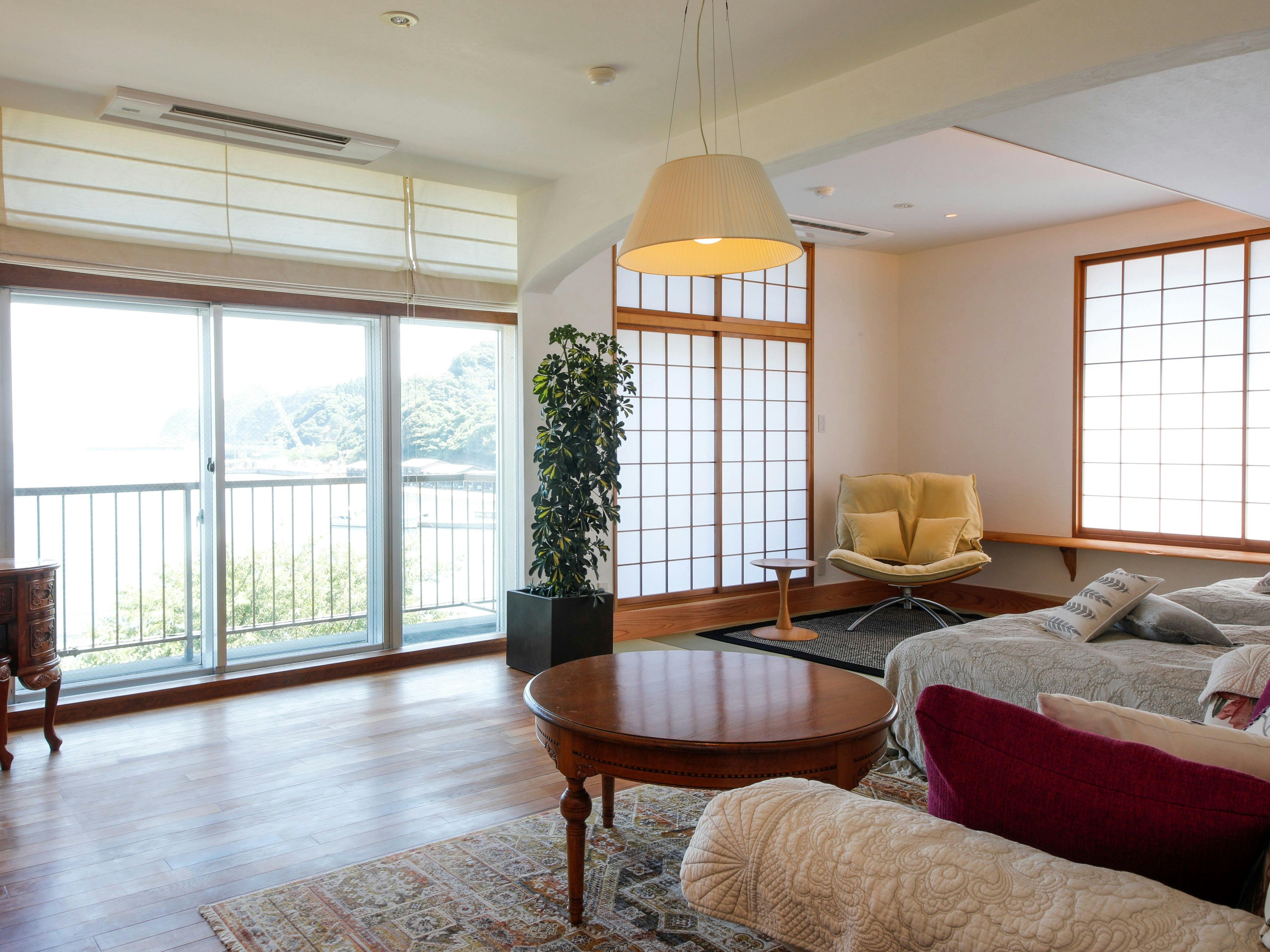 「お部屋説明」海一望のヒノキ展望風呂シャワー脱衣室洗面所和室<本間8畳>リビングルーム<22平米>60インチ液晶テレビ(DVD)3人掛けソファー、1人掛けソファー、空冷蔵庫ベッドルーム<アルフレックス・セミダブル×2台>自動ウォシュレット※お食事は2階の食事部屋<テーブル席>となります。