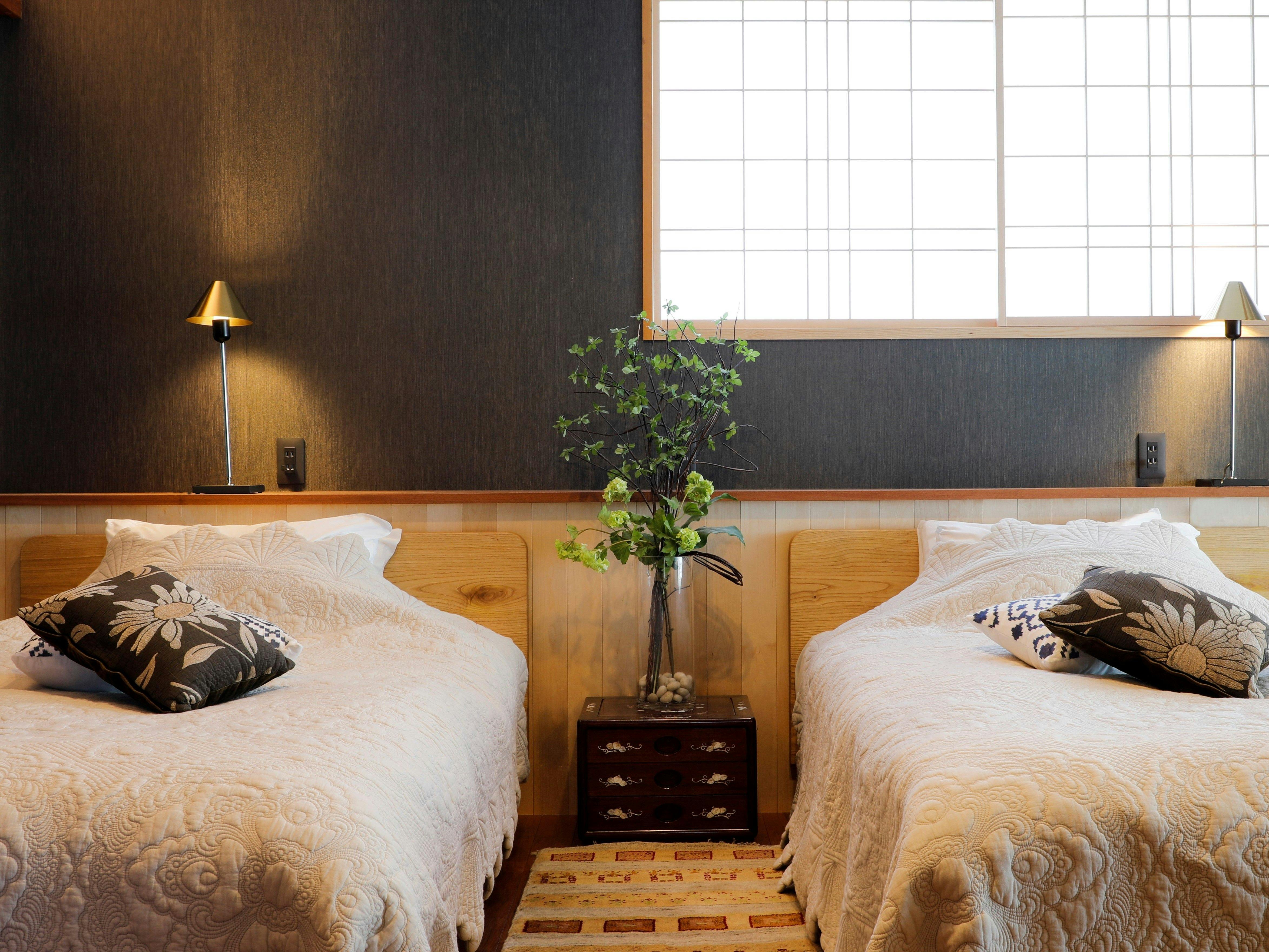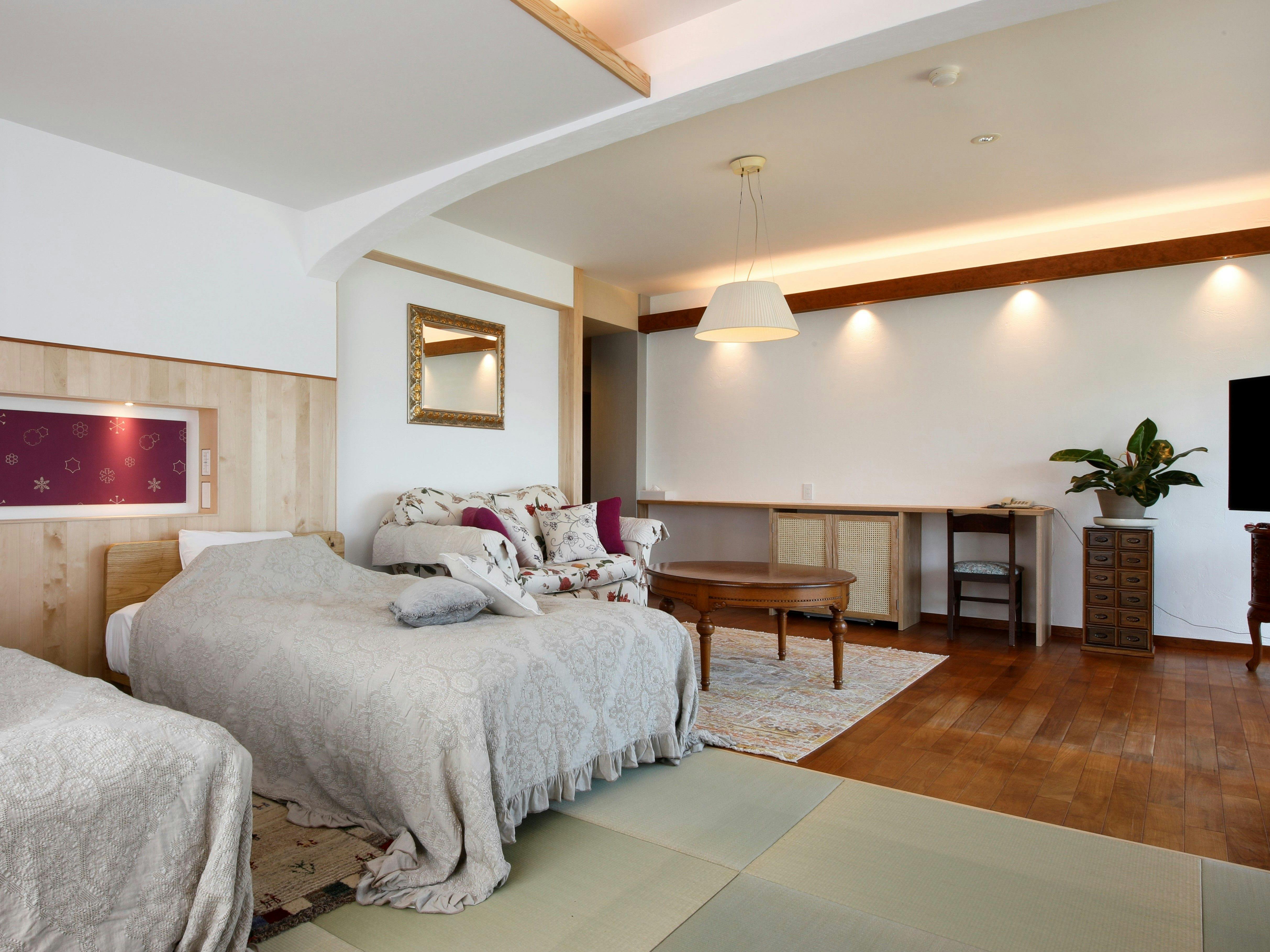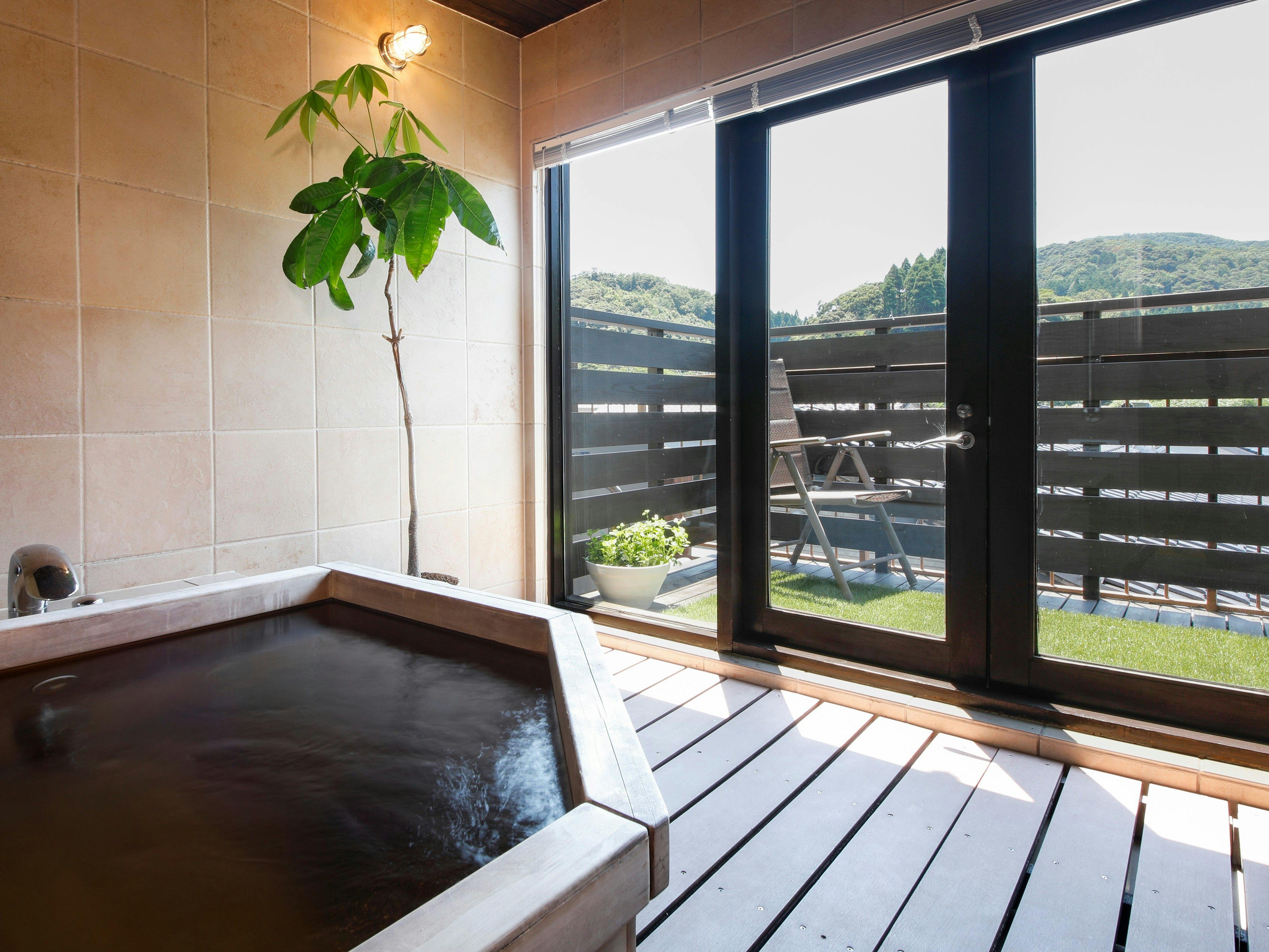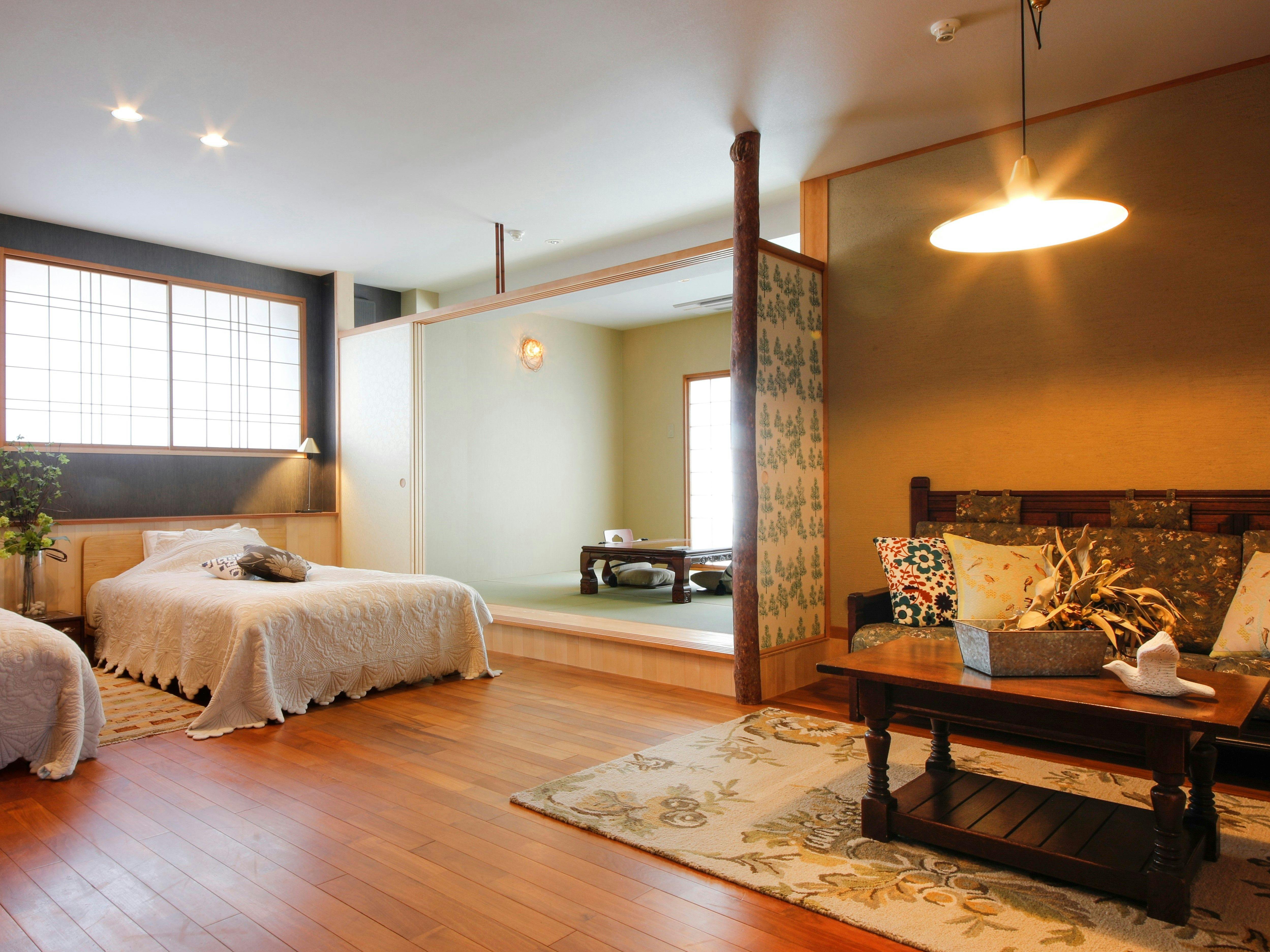 「お部屋説明」デッキ付ヒノキ風呂(循環式)、シャワー、脱衣・洗面室和室<本間4畳>セミダブルベッド2台、リビングルーム50インチアンドロイドテレビ、3人掛けソファー、空冷蔵庫ウォークインクローゼット自動ウォシュレット※お食事は2階の食事部屋<テーブル席>となります。
