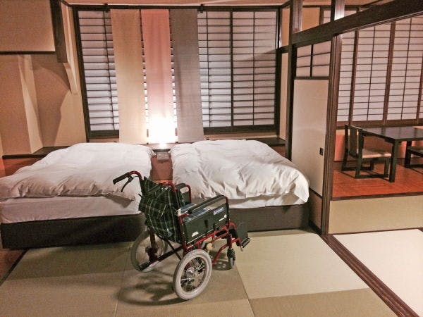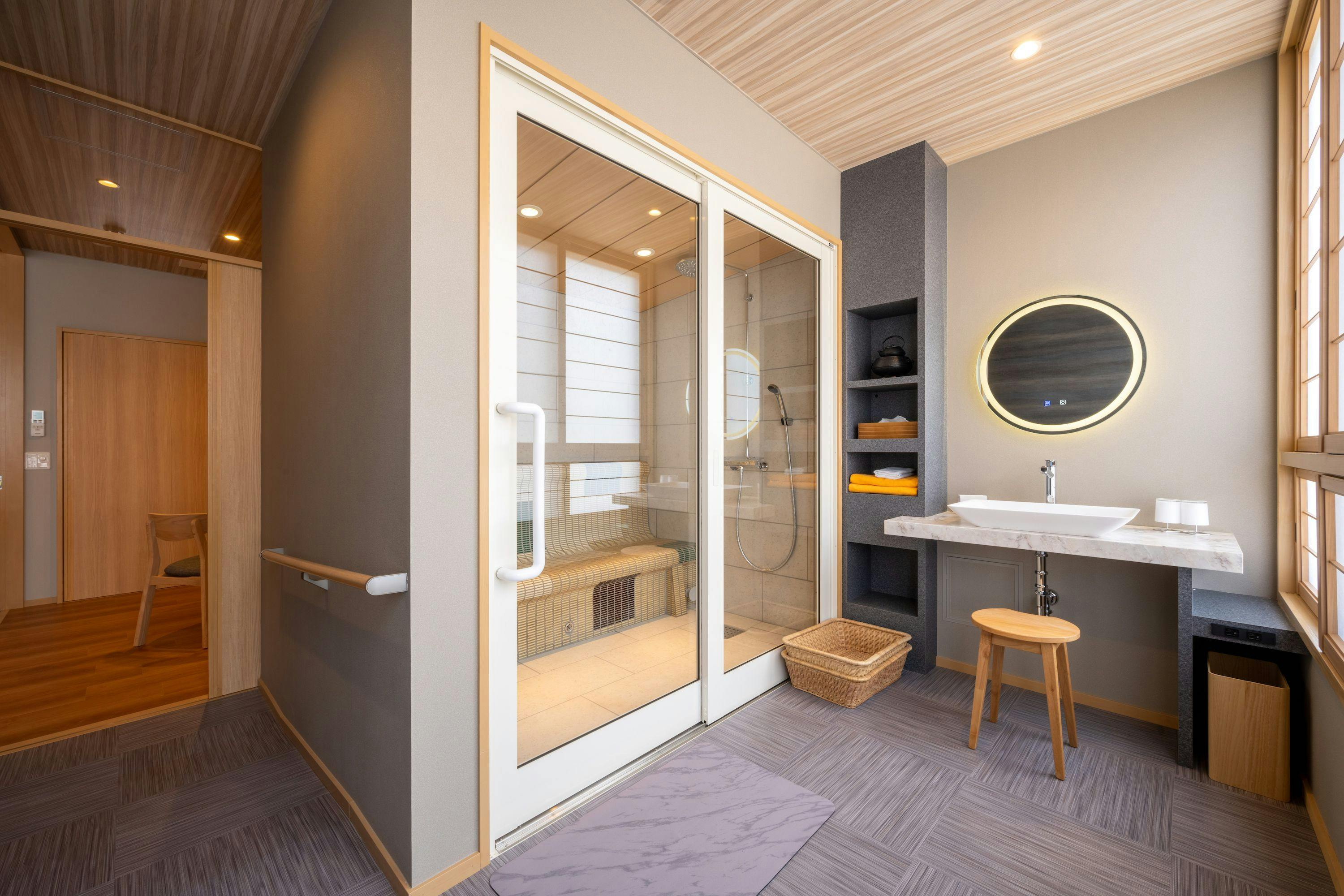 車椅子のまま入れるスチームサウナ付きのバリアフリーツインルーム。