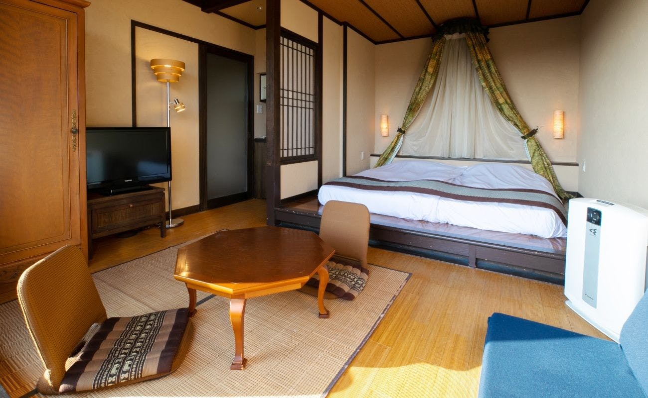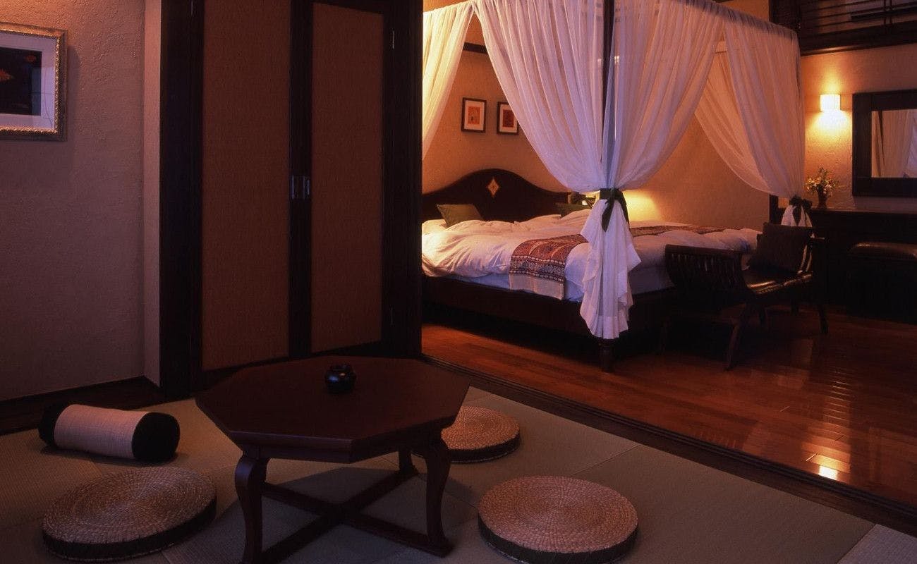 アジアン空間の天蓋付き洋室は2人だけで広々とVIP使用するのもお勧めです。