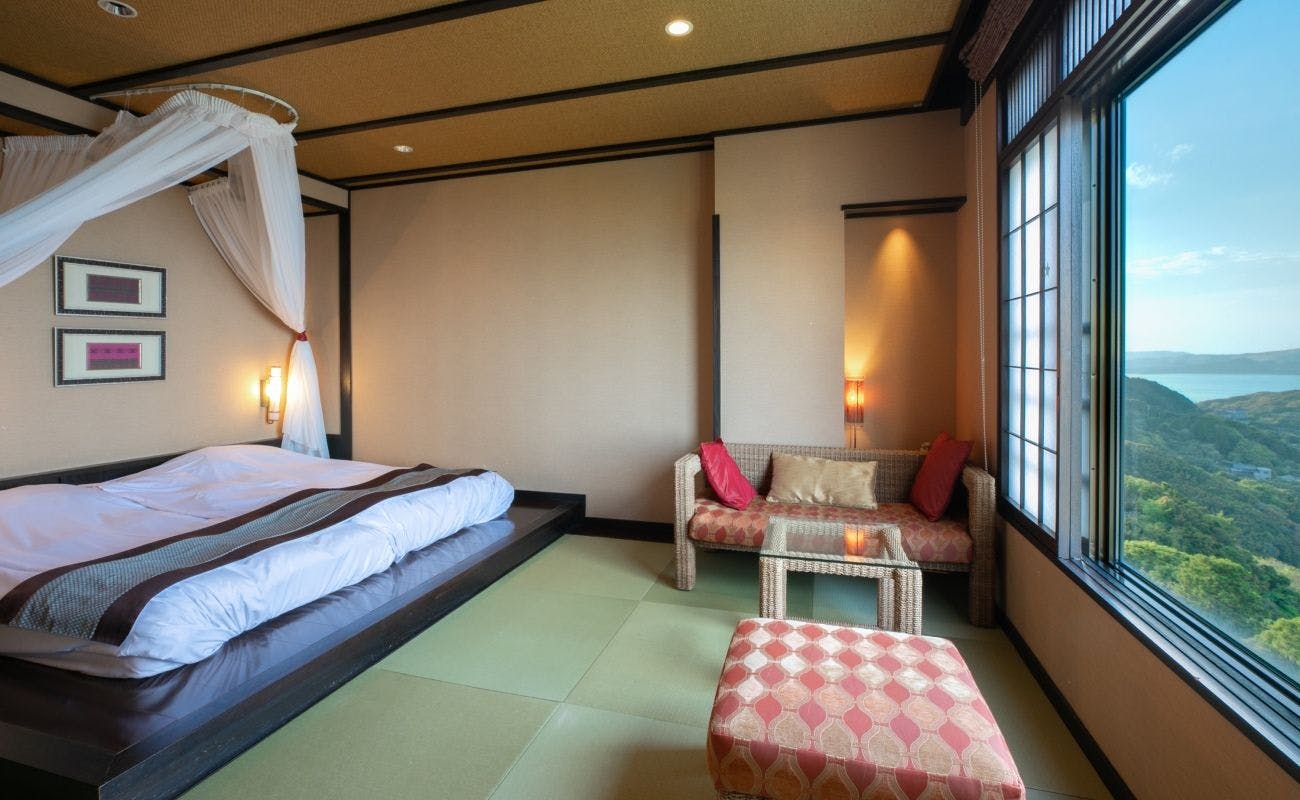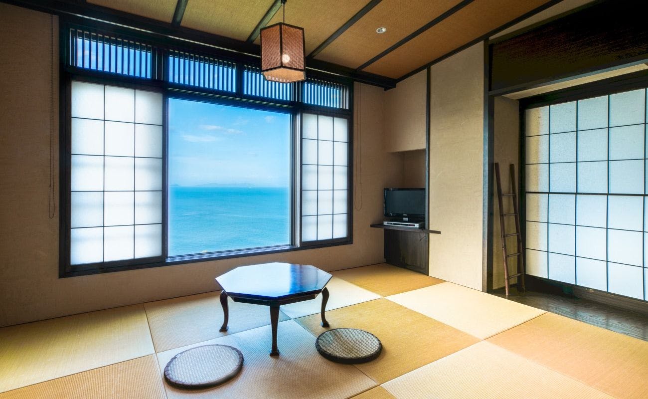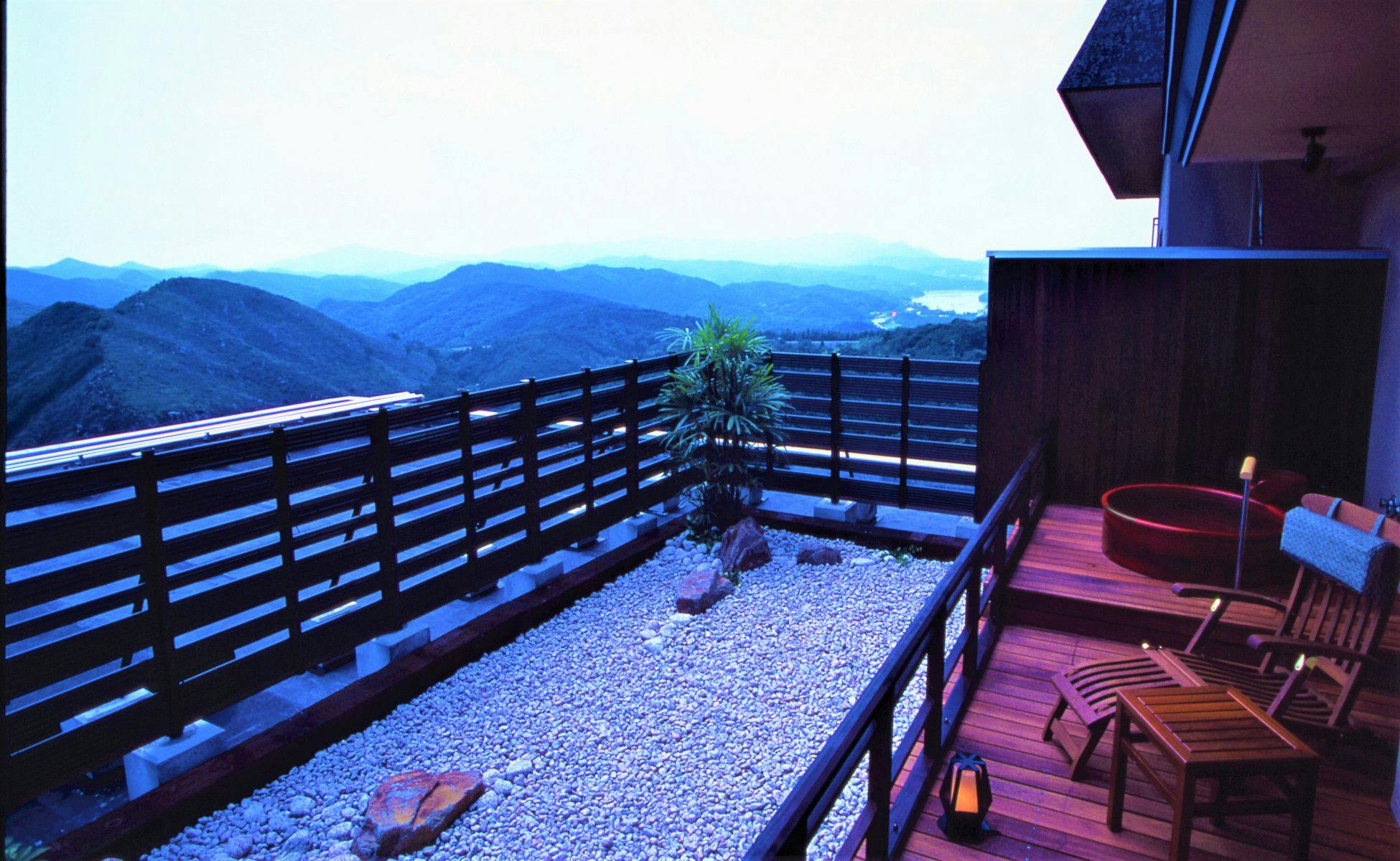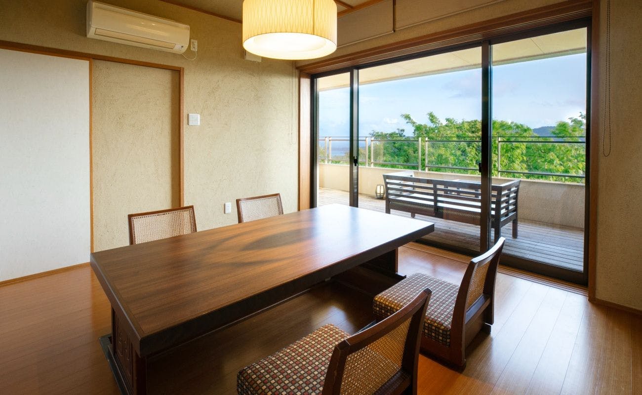 広々としたテラス付きの和室です。鳥羽の山と海の景色が楽しめます。