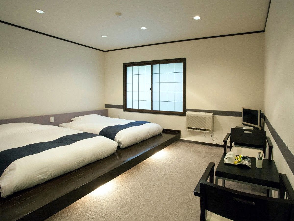 \壁紙、床材など一部リニューアル/※リニューアルにつき内装がお写真と異なる場合がございます。■1階の洋室のお部屋■低反発のゆったりセミダブルが2組■敷き布団使用で3名様までご利用いただけます■洗面・バス・シャワー付きトイレ・アメニティー完備 ■ドライヤー・加湿器貸出可■冷蔵庫あり■扇風機貸出可・暖房完備(エアコン無し)■洋室にはコーヒーをご用意しております■無料Wi-Fi完備