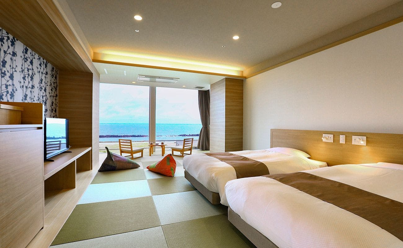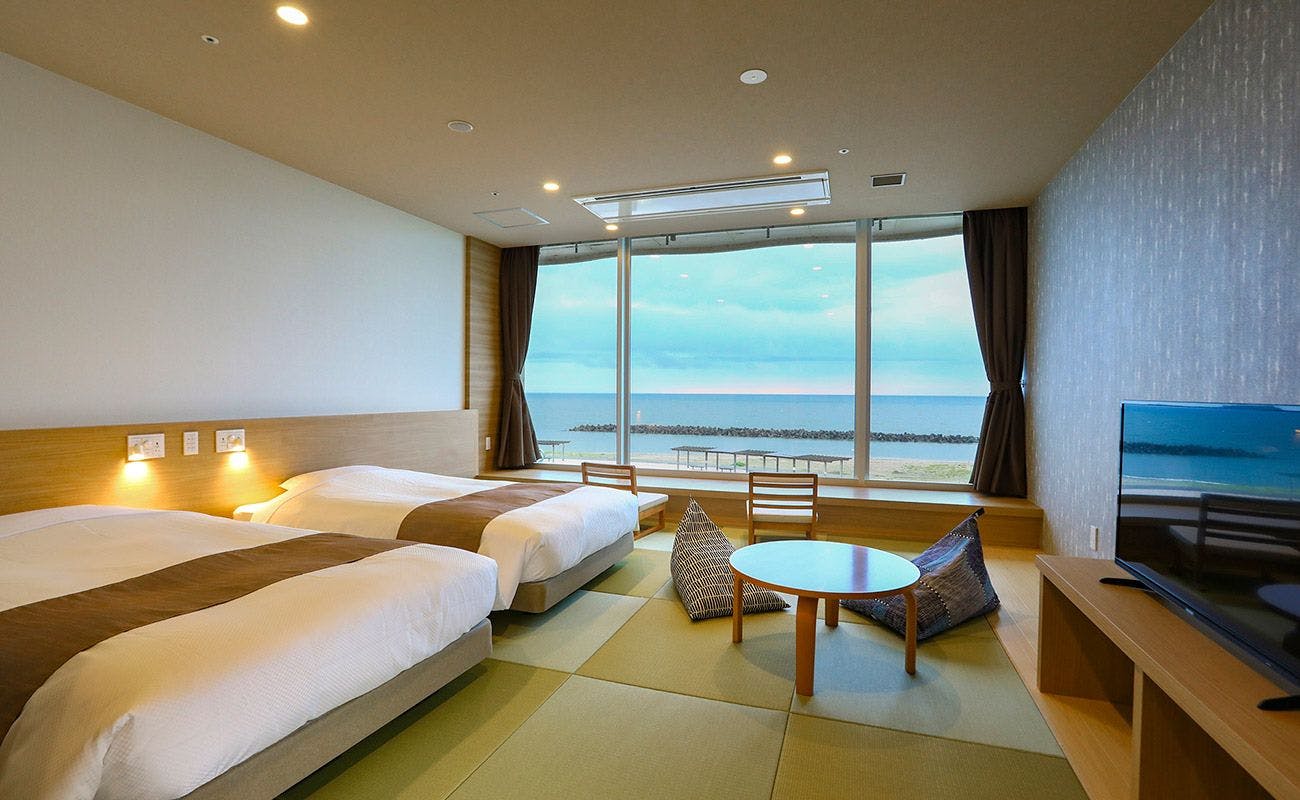 夕映えの宿 汐美荘が大江戸温泉物語としてリニューアルオープン。プライベートな空間を満喫できる露天風呂付き客室からリーズナブルな客室まで幅広くご用意。目の前の瀬波ビーチまでは徒歩30秒と海水浴にも最適。