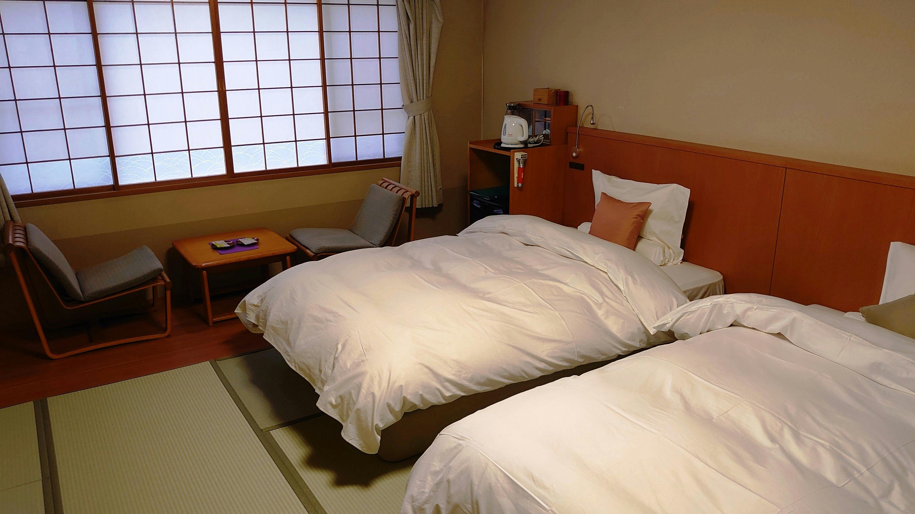 日常の喧騒を離れ、ひとときの休息を、我が家の気分でゆっくりお過ごしください。皆様のリクエストにお応えし、ベッドのある客室をご用意させて頂きました。2名様用の客室となります。お部屋には、ウォシュレット付トイレと洗面台が設置されております。お風呂はございませんので、源泉かけ流しの大浴場をご利用下さいませ。