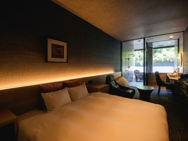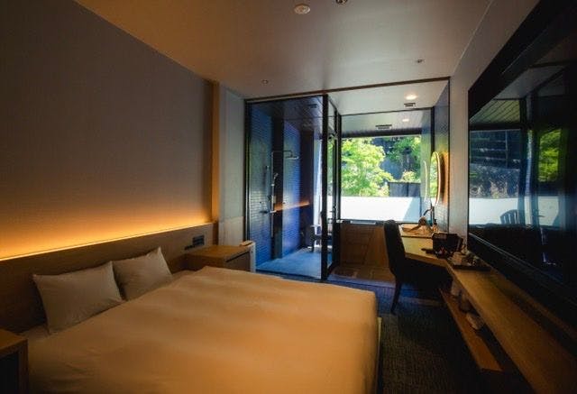 好みの温度に調整できる個室サウナがついた特別室。セルフロウリュウを行うことができ、16度設定の冷水シャワーとリクライニングチェアでととのうことができます。日尾山を眺めることができるフォレストビューです。