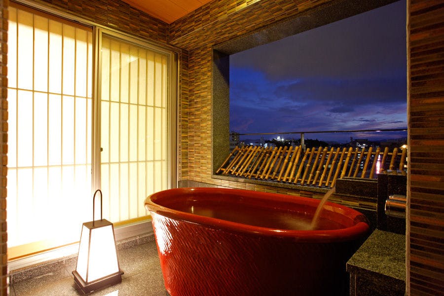 客室内は琉球畳を使った南国テイスト溢れる空間で、窓からは高知城が望めます。