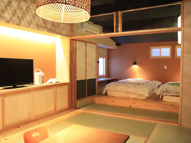 一戸建て離れ半露天風呂付。和室とベットルーム(ツイン)の二間は和風の落ち着いた作り。せせらぎを聞きながら入れる半露天風呂のお湯は弘法大師ゆかりの湯