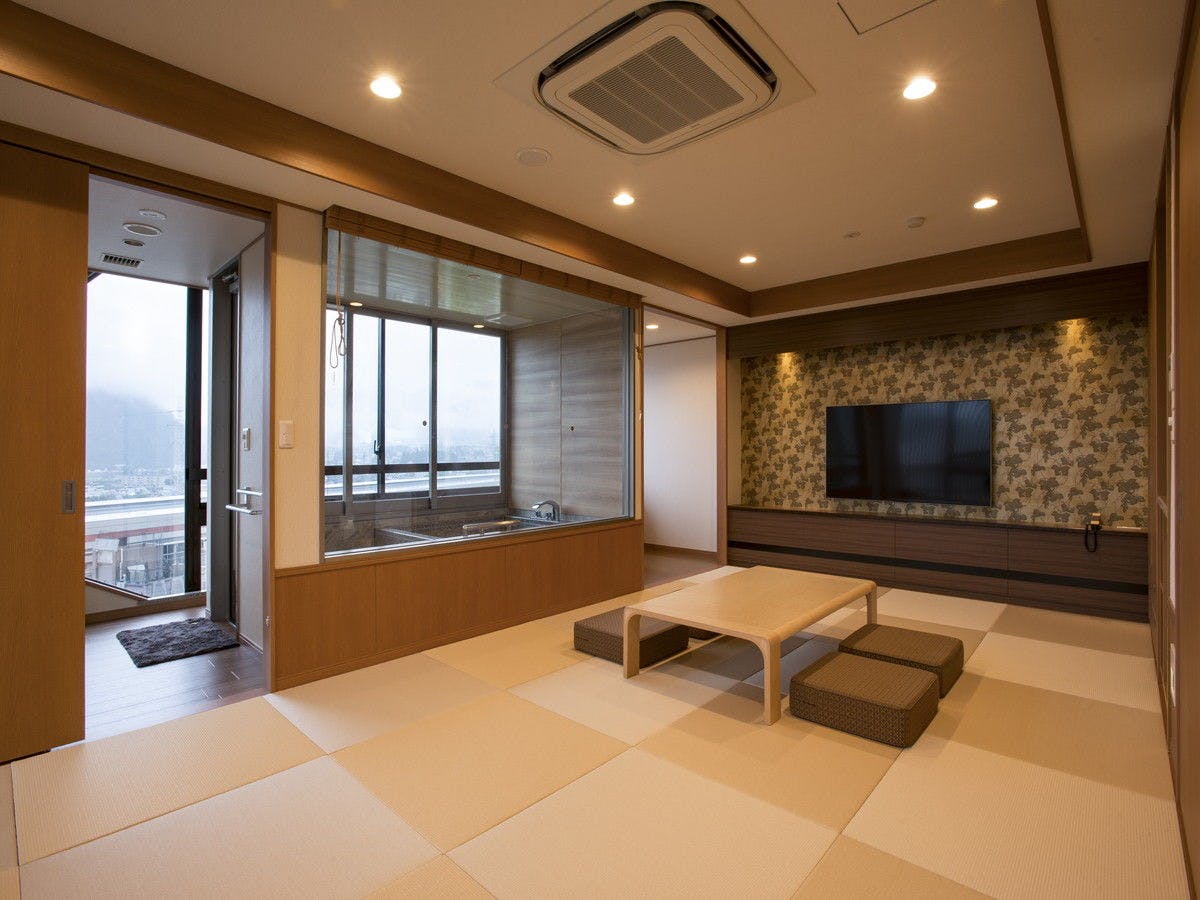窓辺にお風呂を設えた「半露天風呂付き」のお部屋です。