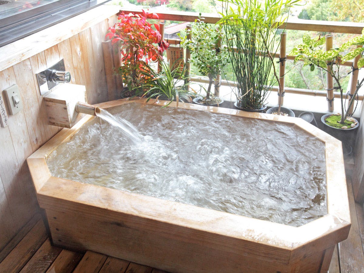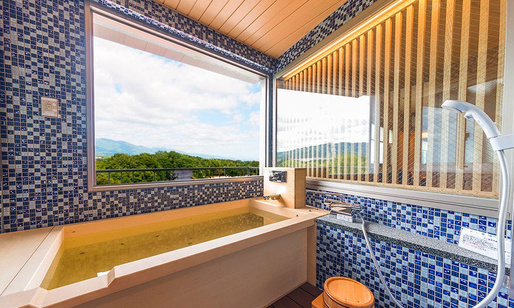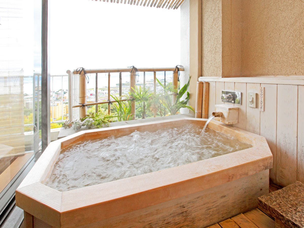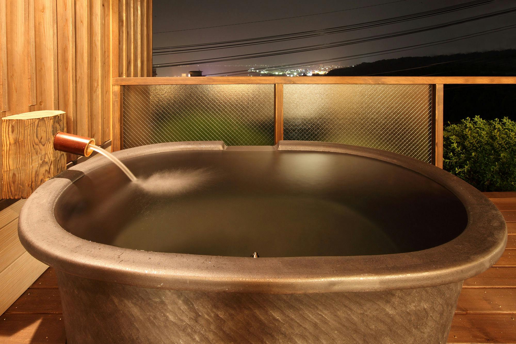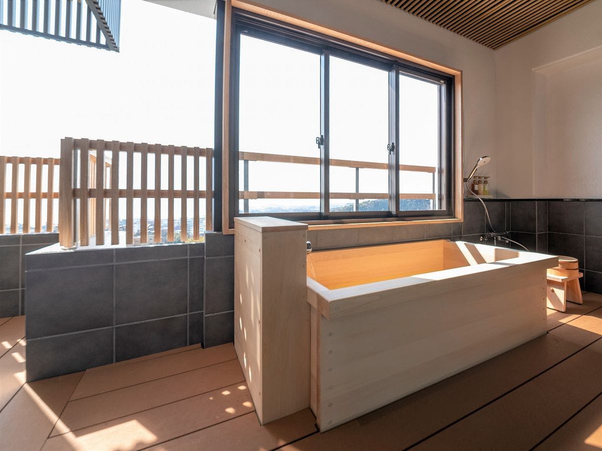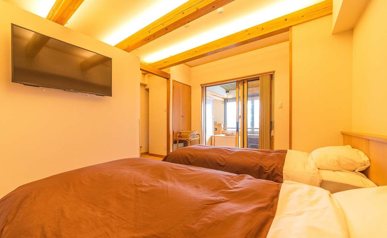 80平米の客室には、リビングルームとツインベッド(シモンズ製)の洋室、ベランダには露天風呂とシャワーブース、デッキチェアを配し、ゆったり過ごせるゆとりの造り。
