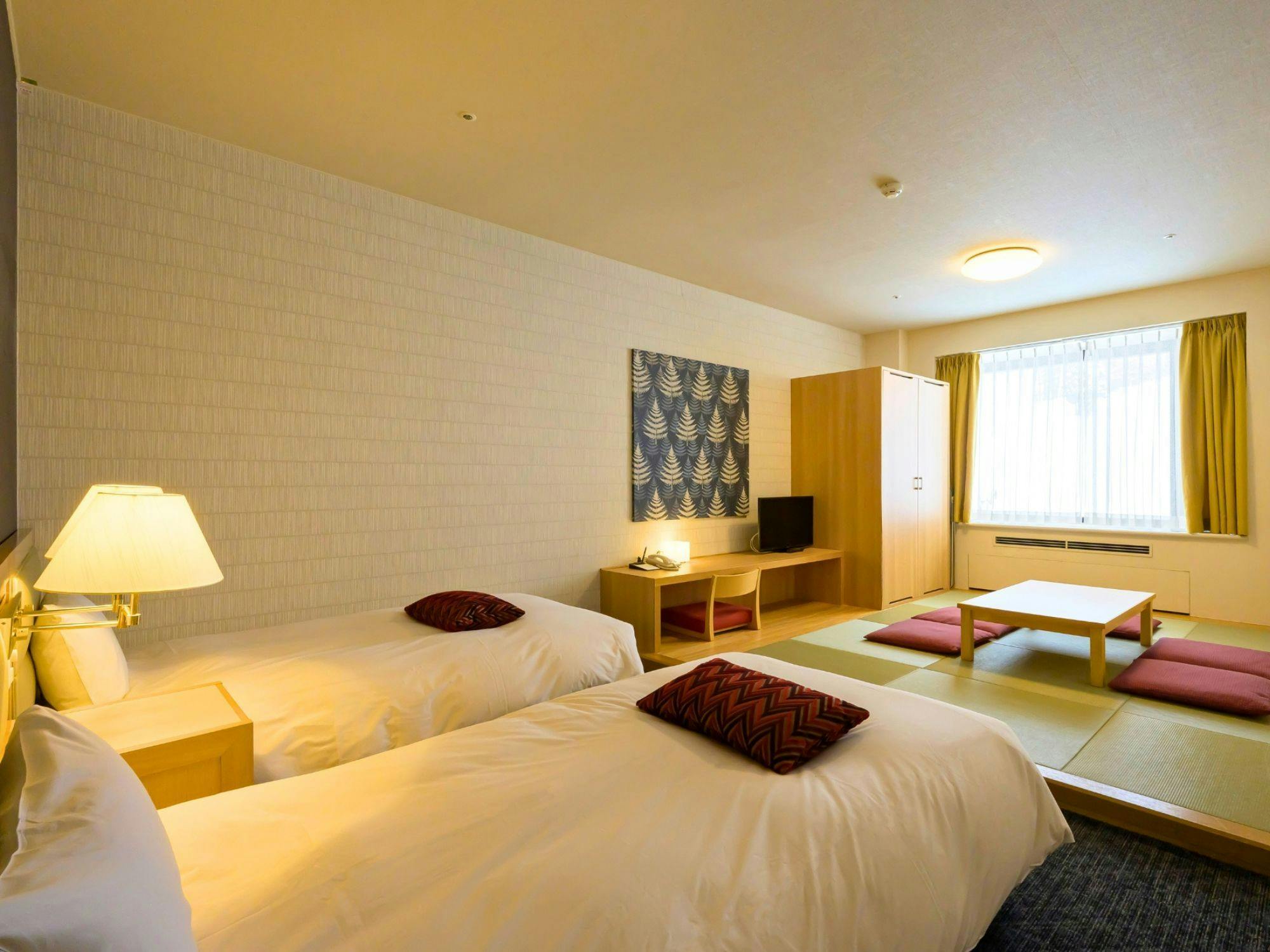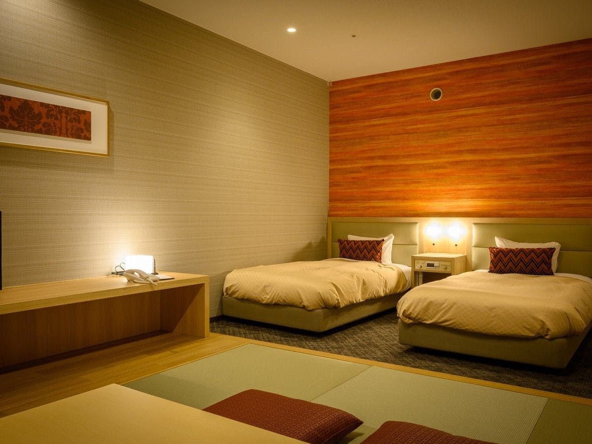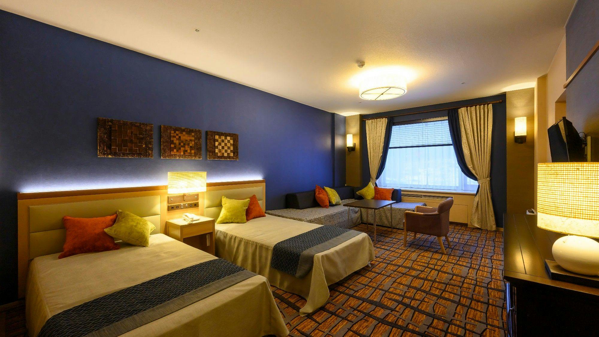 ツインベッド+畳コーナーに布団3組(5名定員/約40平米/4階)
