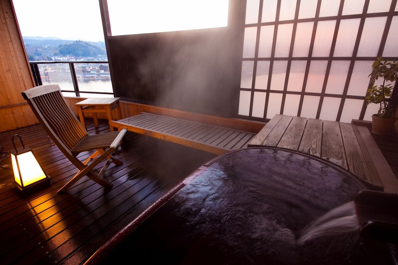 みくま川を臨む、眺めのいい露天風呂付の洋室です。※客室の露天風呂は温泉ではございません。