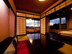 みくま側を望む信楽焼きの露天風呂が付いた和室10畳のお部屋です。※客室の露天風呂は温泉ではございません。
