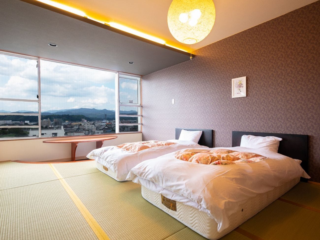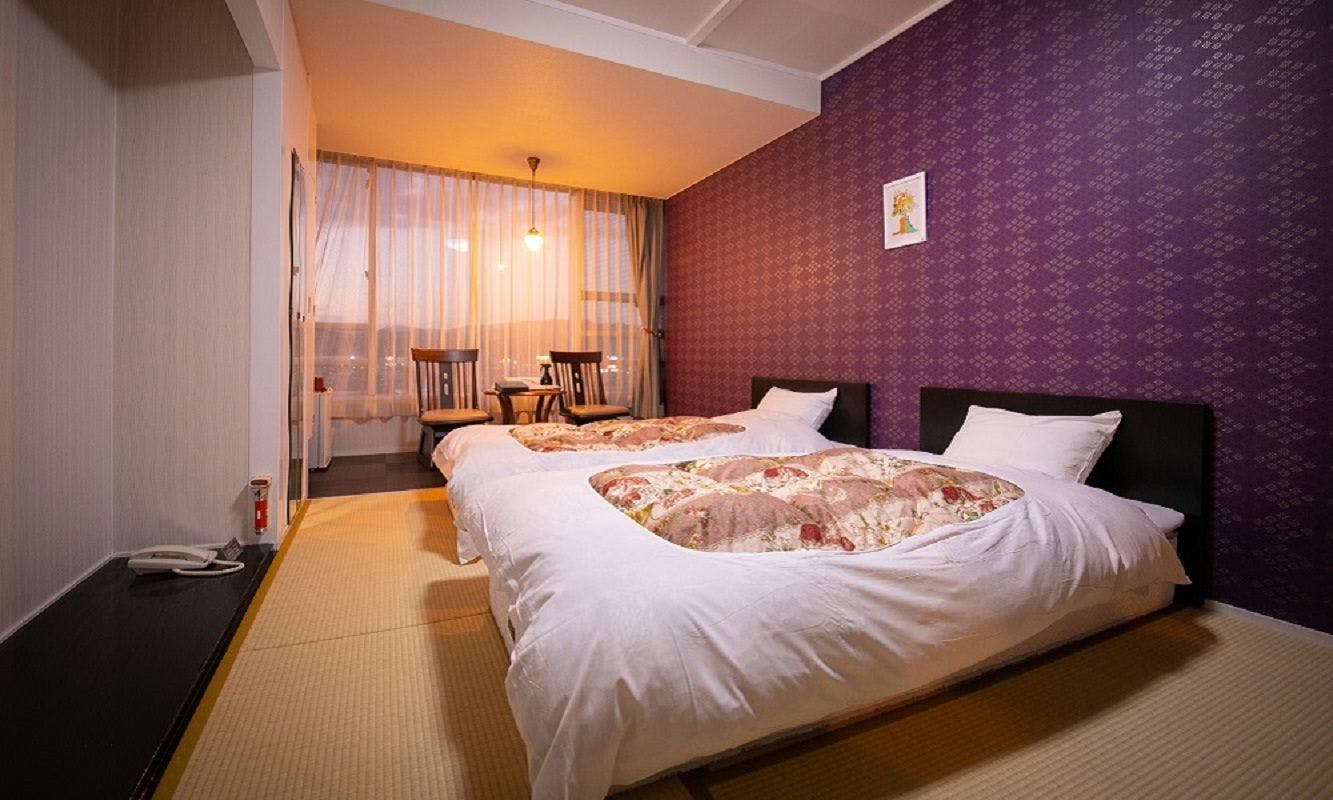 日田の市街地を望むお部屋です!お二人専用の客室で、ご夫婦やカップルでの利用に最適な広さをご用意しております。一人用ベッド2台(ツインベッドタイプ)・ルームチェア有 ウォシュレットトイレ・保冷庫・無料Wi-Fi利用可能!※3名様でご利用の際はお布団をご用意させて頂きます。