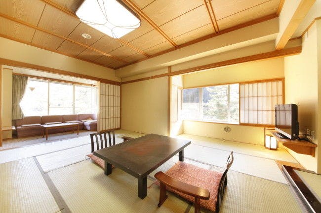 10畳+6畳のゆったりした客室からは美しい新緑や山間の景色を眺め 落着いた漆塗りの調度品等が配された寛ぎの空間。ユニットバスに変わり、シャワーユニットを完備。