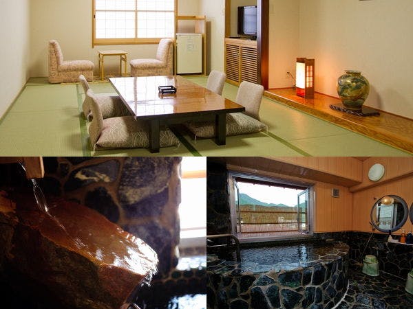 和室はゆとりの15畳。温水洗浄トイレ付。館内で唯一の温泉付客室です。