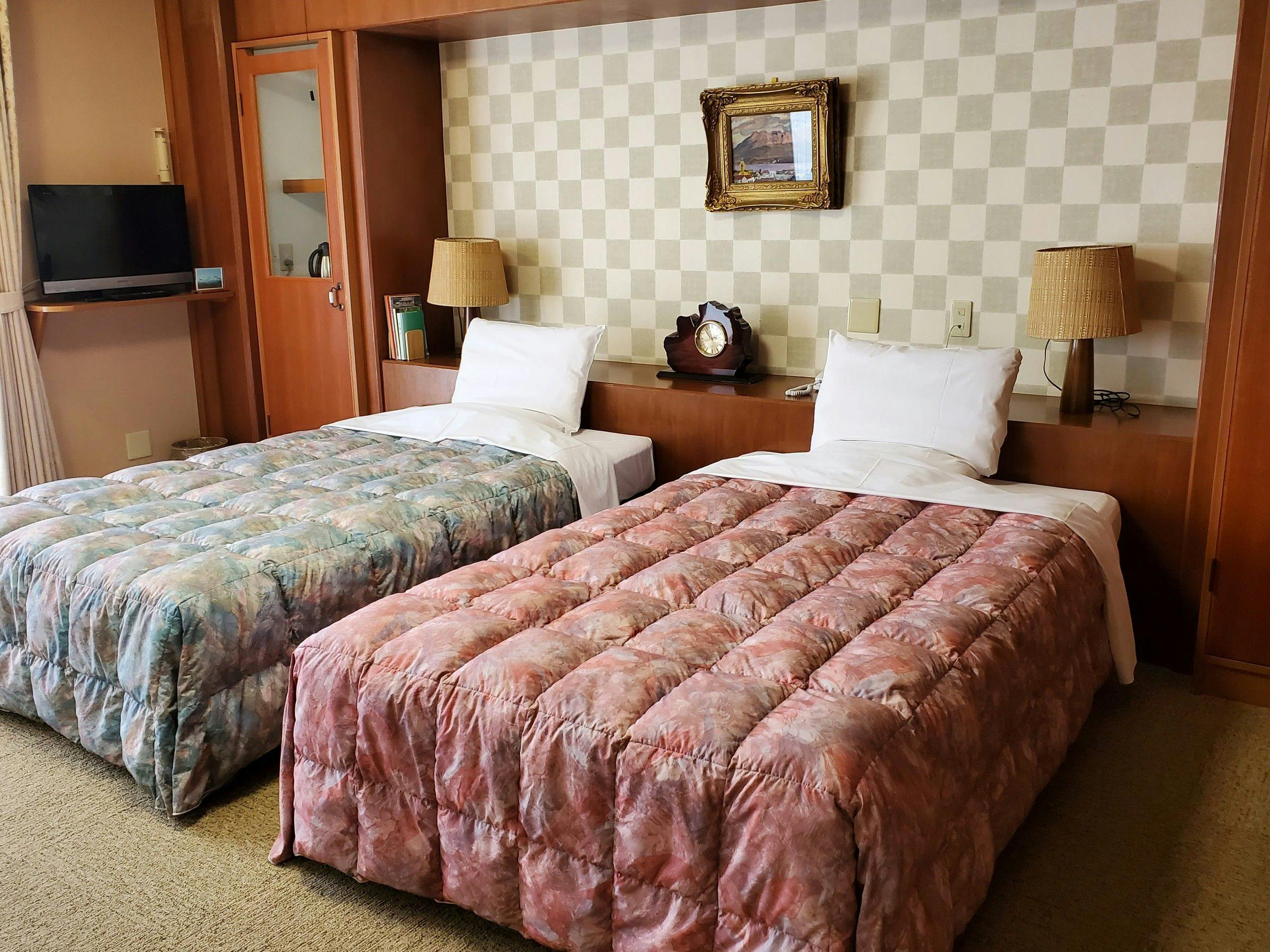 眺望の良い洋室ツイン。遠く錦江湾に浮かぶ桜島の風景がご覧いただけます。