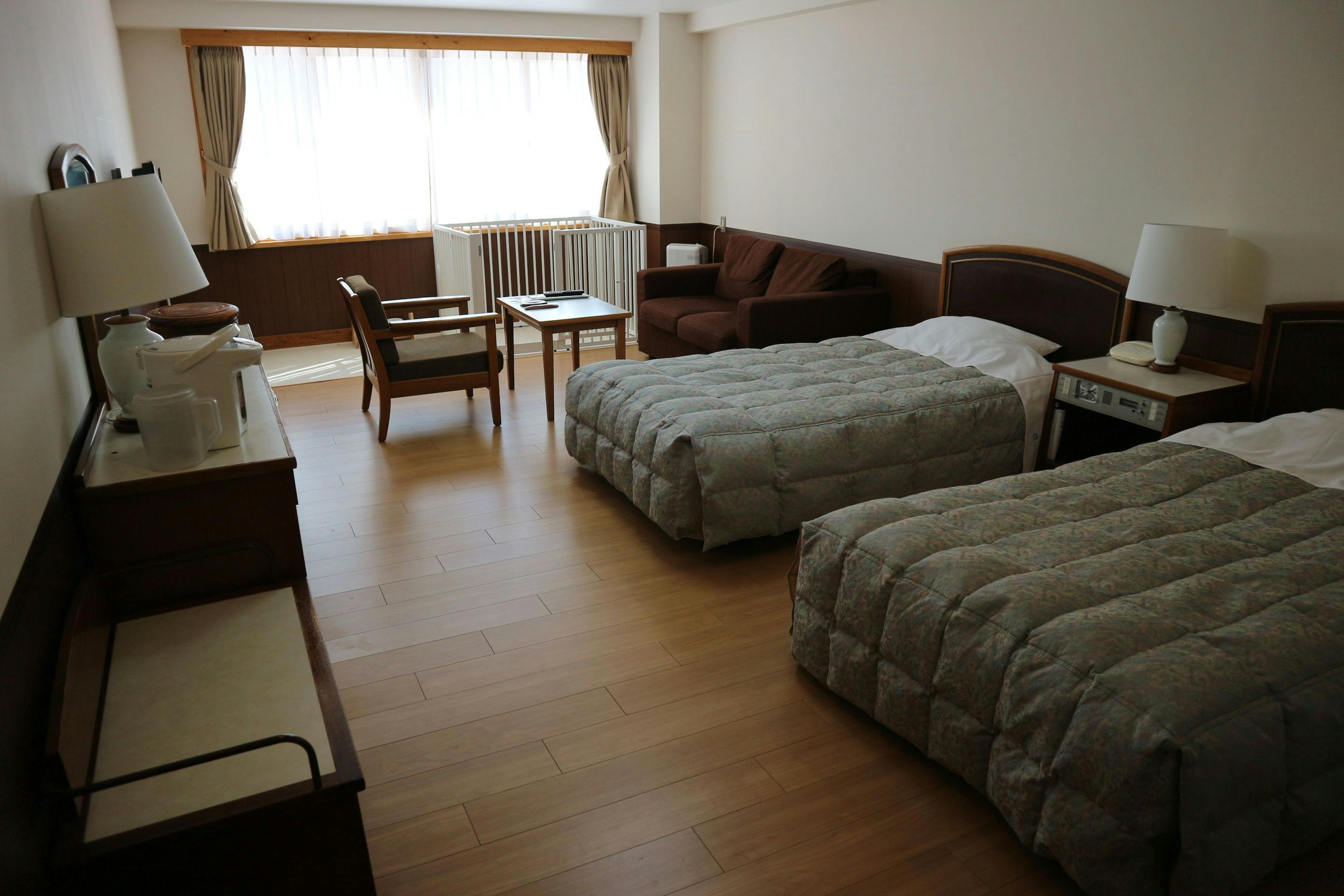 2頭までの中型までのワンちゃんと一緒に泊まれる洋室のお部屋です。3名様で泊まる場合は1名様はソファーベッドになります。また、部屋にはペットサークルを用意してあります。