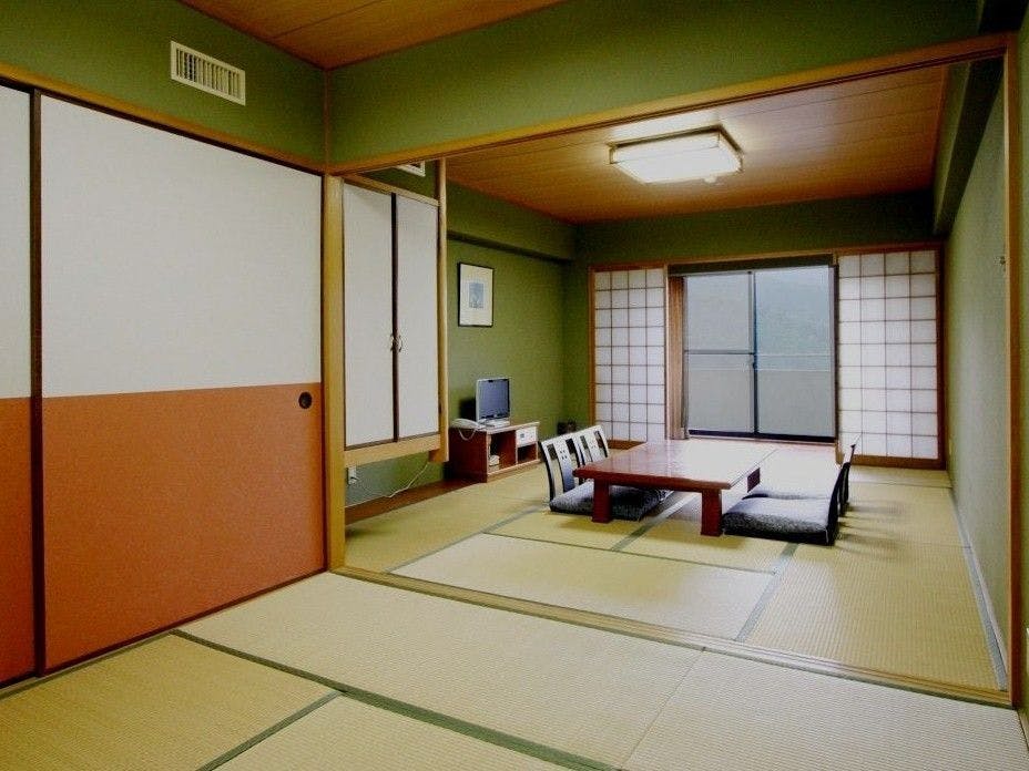 ●温泉に来たら、畳のお部屋で!客室は全室山側。10畳と4.5畳の二間続きの和室で、ごゆっくりお過ごしください。●ご利用 :2名様~5名様●洗浄機能付きトイレ、冷蔵庫、テレビ付き。バスなし。●お布団敷きはセルフサービスとさせていただいております。