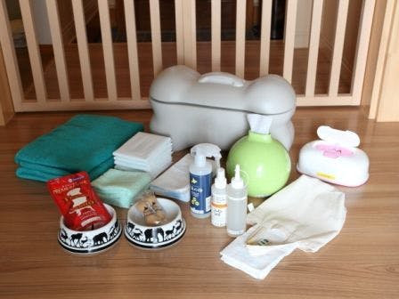 バスタオル・足拭きタオル・ウェットティッシュ・モップ・粘着ローラー・トイレシート・トイレトレー・除菌消臭スプレー・散歩用ウンチ袋・散歩用消臭液・ケージ(クレート)・脱臭機・食器・おやつ