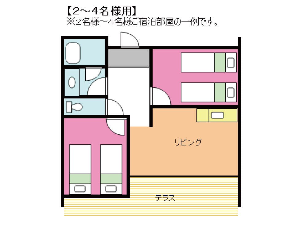 シングルベッド4台・液晶テレビ・バスルーム・洗面台・トイレ・冷蔵庫・脱臭機・電気ポット・ドライヤー・エアコン