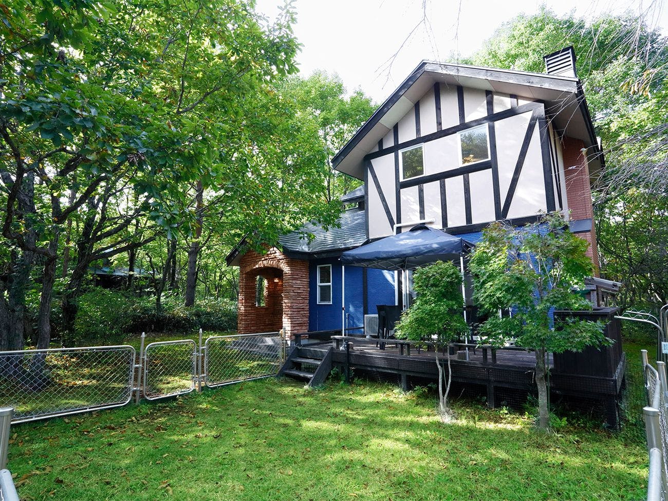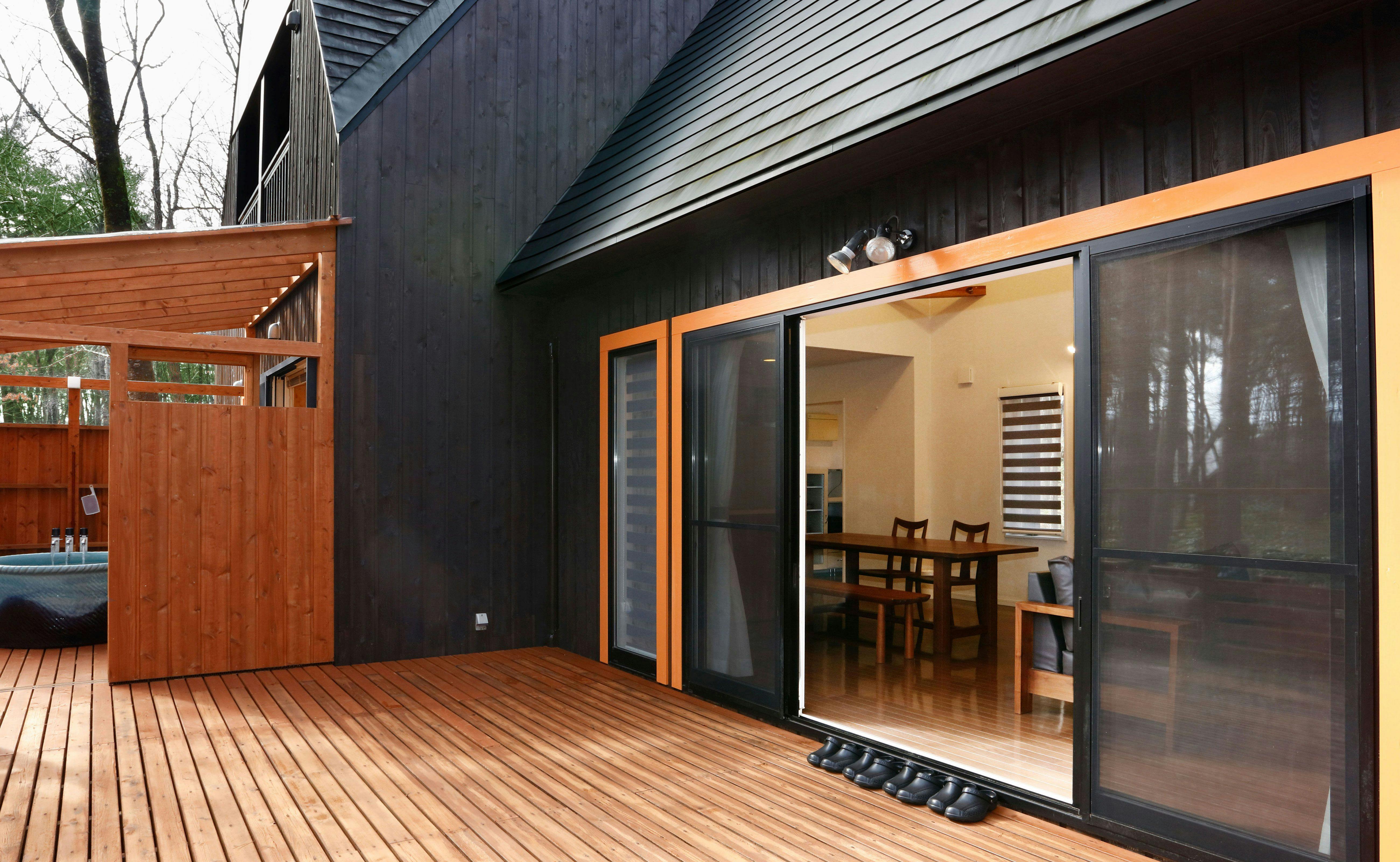 屋根で覆われたウッドデッキは、テラスBBQやドッグランとしてもゆったり使える総面積約42平米広さを確保。テラスで愛犬と寛ぐも良し、天候を気にせずBBQパーティーに興じるも良し。滞在の楽しみが広がります。