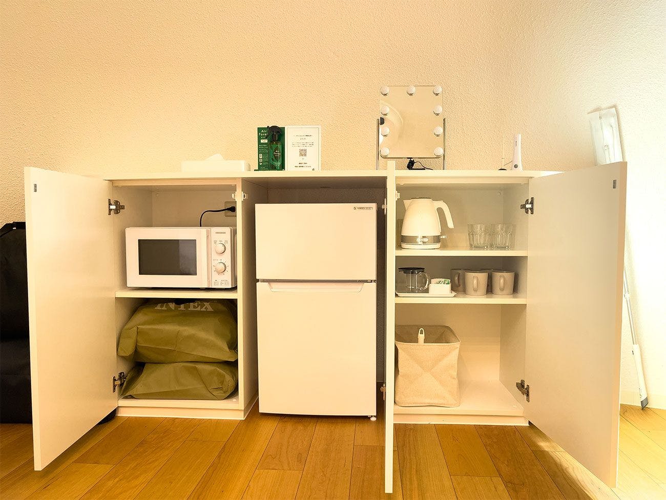 アメニティ:パジャマ、バスタオル、ハンドタオル、スリッパ、シャンプー、コンディショナー、ボディソープ、クレンジング、乳液、歯ブラシ、髭剃り、ブラシ、ヘアドライヤー、懐中電灯、傘