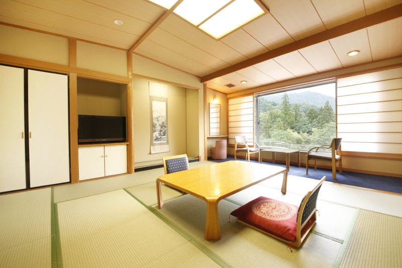 和室12.5畳の、ゆったり寛げる落着きのある客室■お部屋は「袋田の滝」からそそがれる「滝川」のせせらぎと月居山を望めるお部屋温泉大浴場から少し離れた客室タイプとなります。■バス・シャワートイレ付き※部屋のお風呂は温泉ではございません。■洗面所にドライヤー設置あり■窓側に備え付けのドレッサー付■無料Wi-Fi完備■加湿空気清浄機 完備■お部屋は禁煙です。