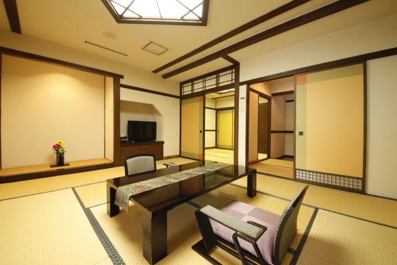 和室12畳に次の間6畳がついたゆったり寛げるお部屋です。■お部屋は夕日側で、眼下に駐車場、袋田の街並みがあり、遠くに山並みとなります。温泉大浴場から少し離れた客室タイプとなります。■バス・シャワートイレ付き※部屋のお風呂は温泉ではございません。■洗面所にドライヤー設置あり■窓側に備え付けのドレッサー付■無料Wi-Fi完備■加湿空気清浄機 完備■お部屋は禁煙です。
