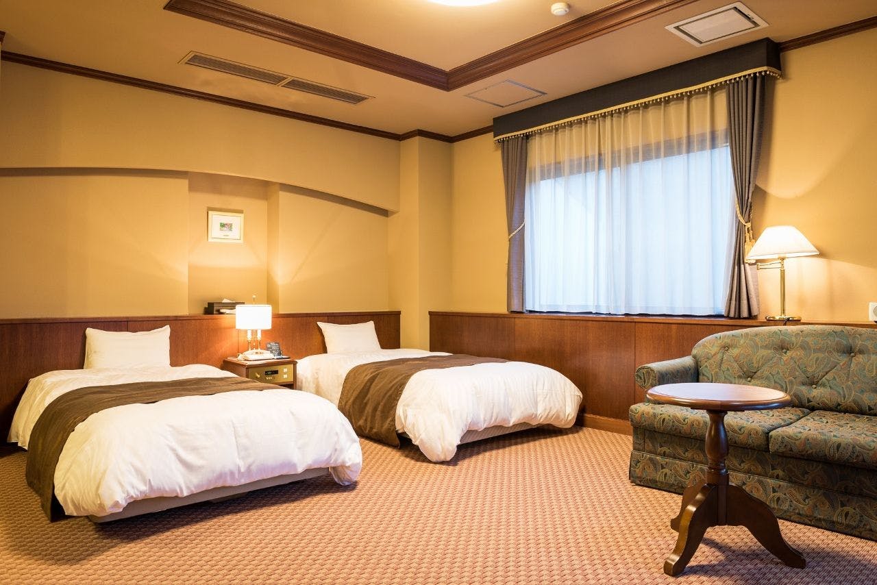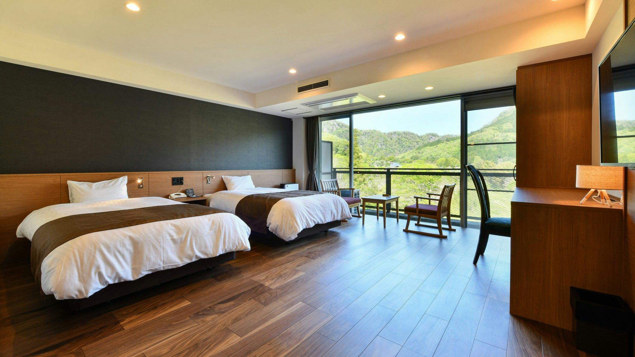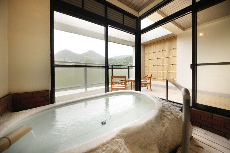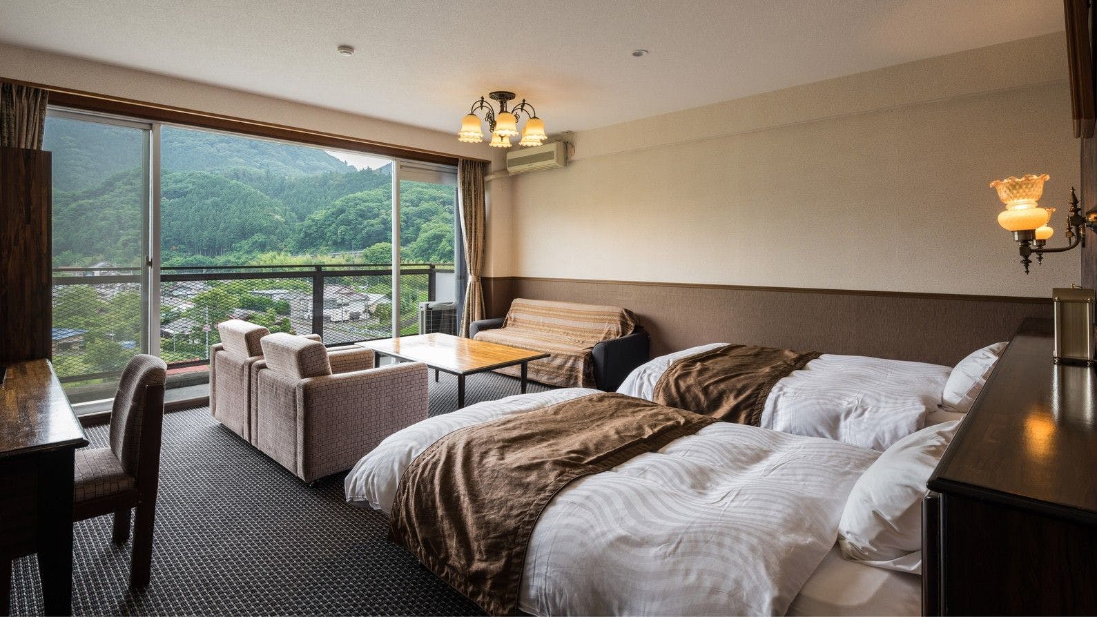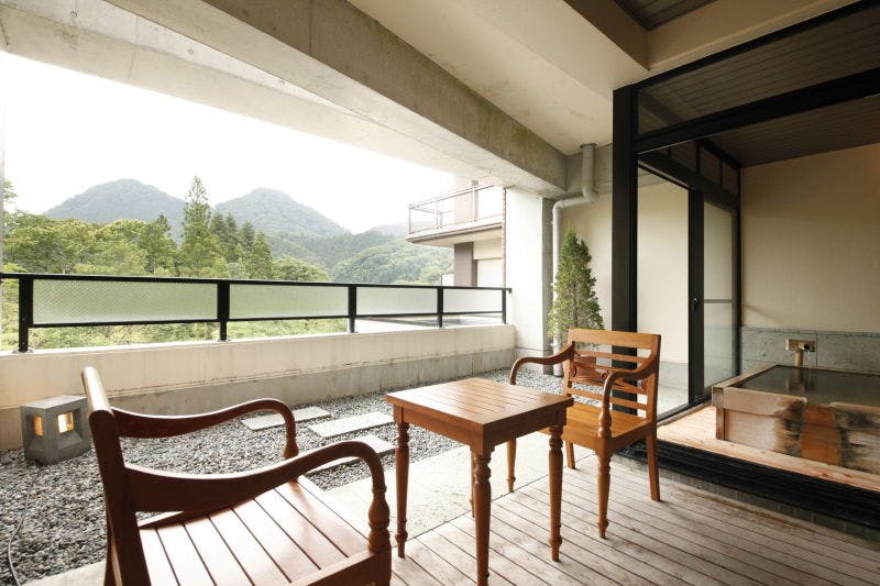 アンティーク調のお部屋のベランダに、良質の天然露天温泉を配した洋室タイプの特別室。クラシックな洋室ツインベッドルームに和室が付いた和洋室<大理石露天風呂と御影石露天風呂の2タイプ>と、ツインベッドルーム洋室のみの御影石露天風呂付きの客室。※お部屋・お風呂の選択のご指定は出来ません。■お部屋にドライヤーあり■無料Wi-Fi完備■加湿空気清浄機 完備■お部屋は禁煙です。