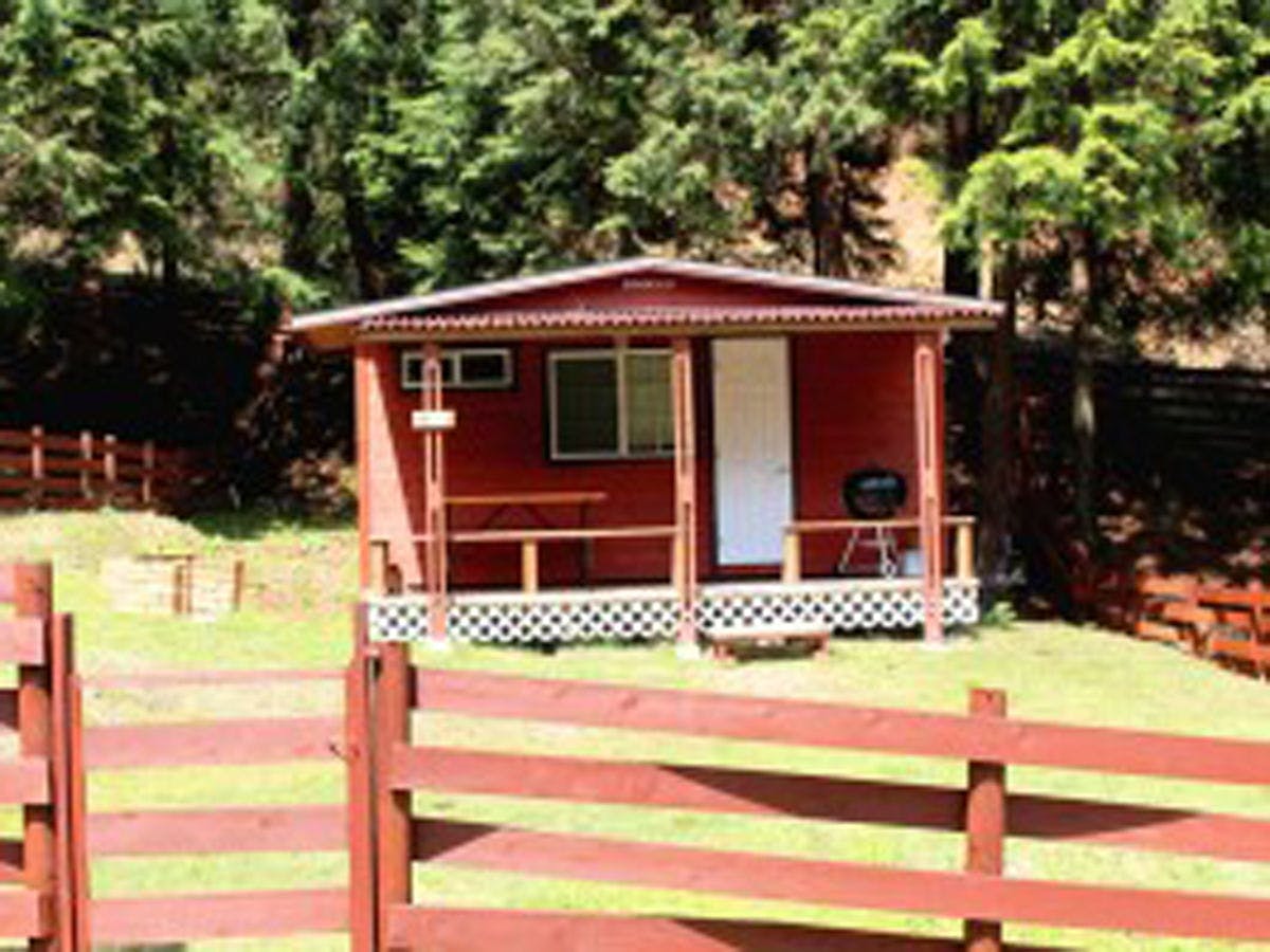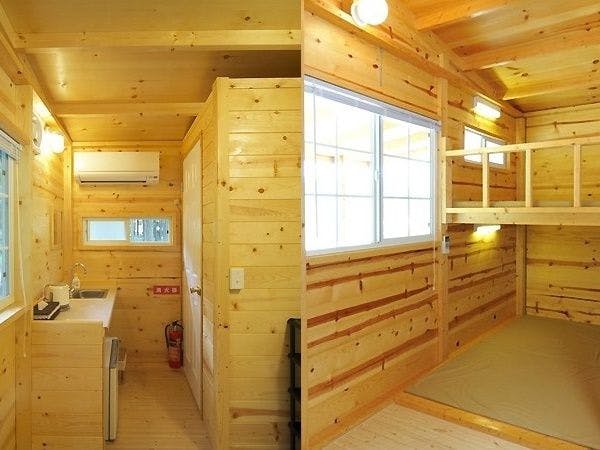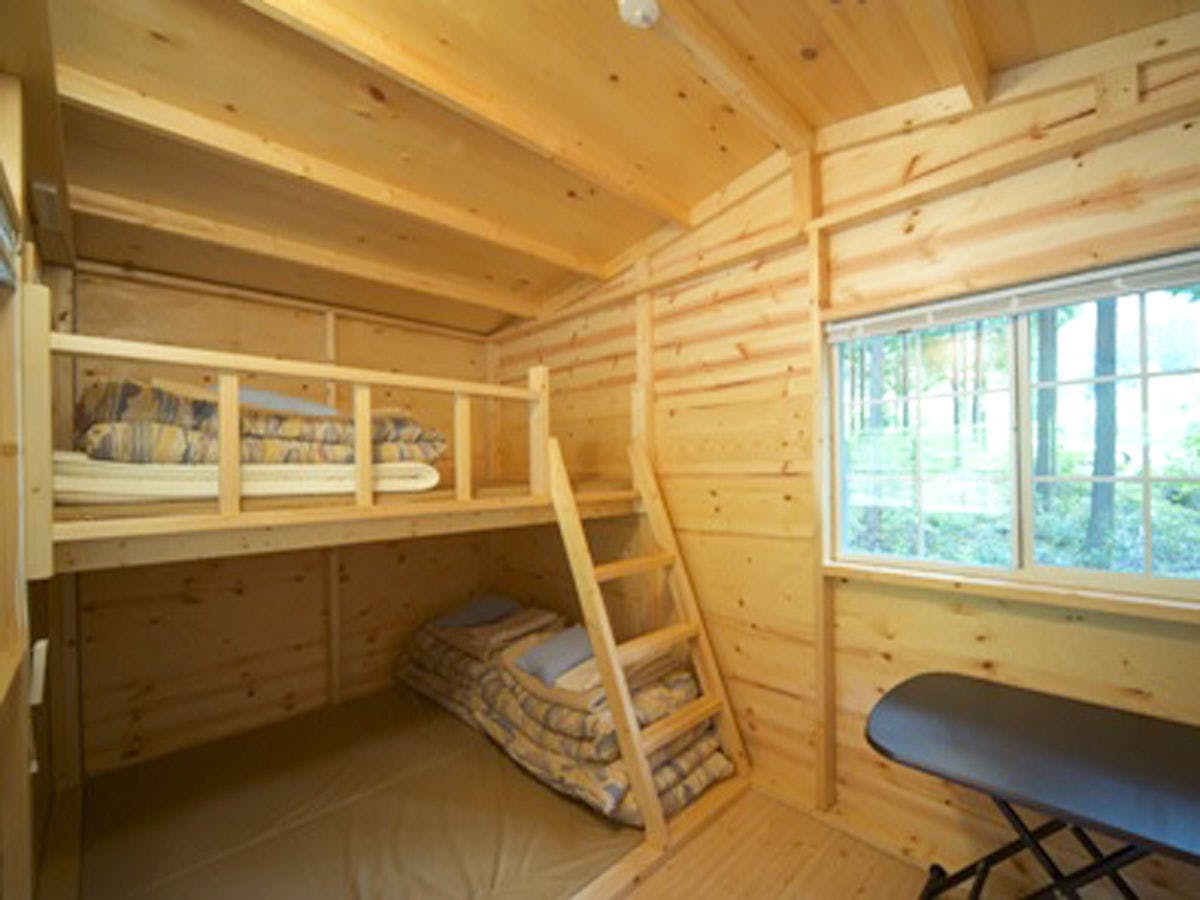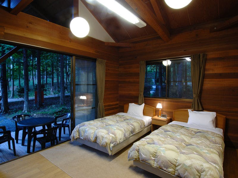 大喜びのベッド付のコテージ。和室、洋室、バストイレ