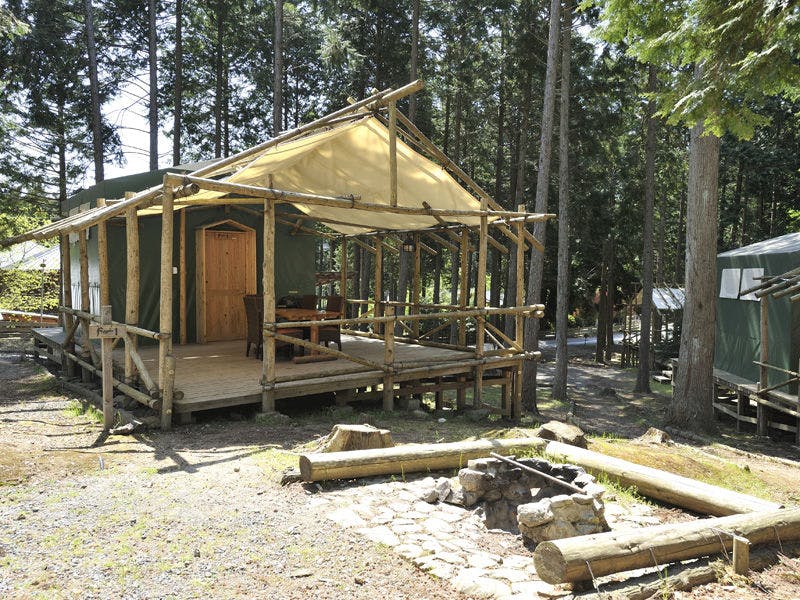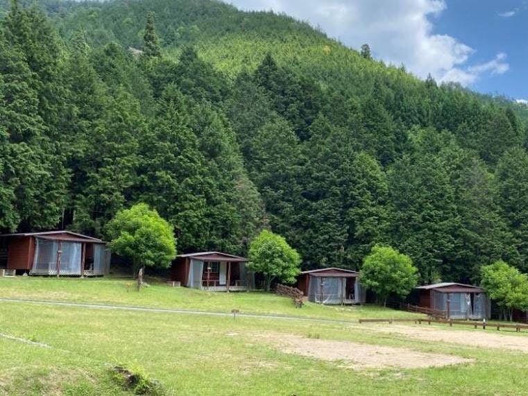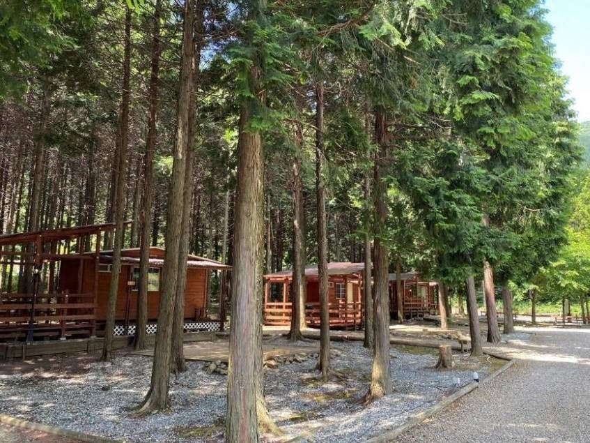 5万平方の森リゾートでオートキャンプを満喫できる宿泊施設。芝生エリアや、森林エリア、川などの自然がたっぷり。大型テントから食器までレンタルアイテムが充実しているので、気軽にキャンプが楽しめます。