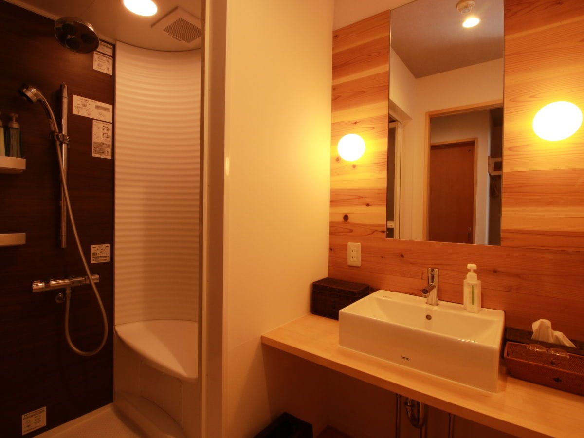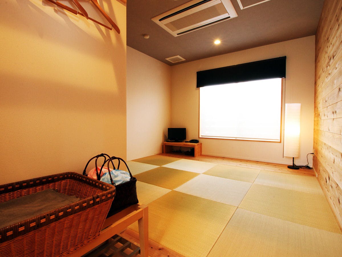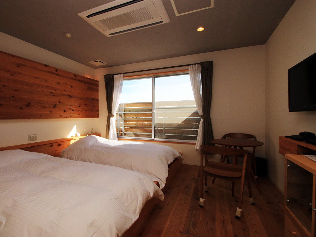 海の水平線をフレンドリーに感じれる一階のお部屋です。 木の温かさとやさしさに囲まれた小上がりにローベッドタイプのお布団を敷いた新感覚の洋間です。※下記「設置ベッド」は小上がりの広さです。【客室アメニティ】・ケトル(0.8L)・地デジ対応テレビ・冷蔵庫・洗面・ドライヤー・シャワー・ウォシュレット付きトイレ・バスタオル・フェイスタオル・歯ブラシ・作務衣