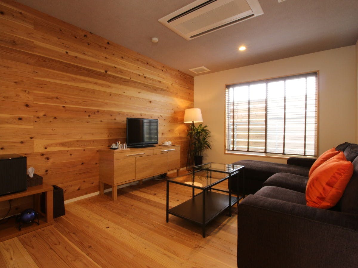 デッキテラスで羽をのばし8畳のリビングの寝椅子付きソファーでゆったり。6畳の寝室のお布団でぐっすりと極上のひとときをお過ごしいただけるワンランク上の特別室です。【客室アメニティ】・ケトル(0.8L)・地デジ対応テレビ2台・冷蔵庫・洗面・ドライヤー・ウォシュレット付きトイレ・バスタオル・フェイスタオル・歯ブラシ・作務衣